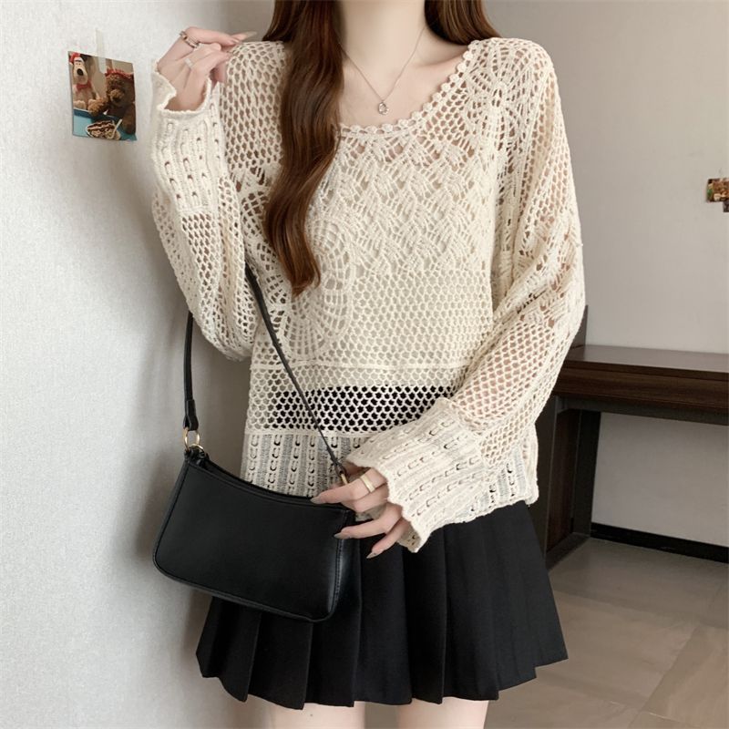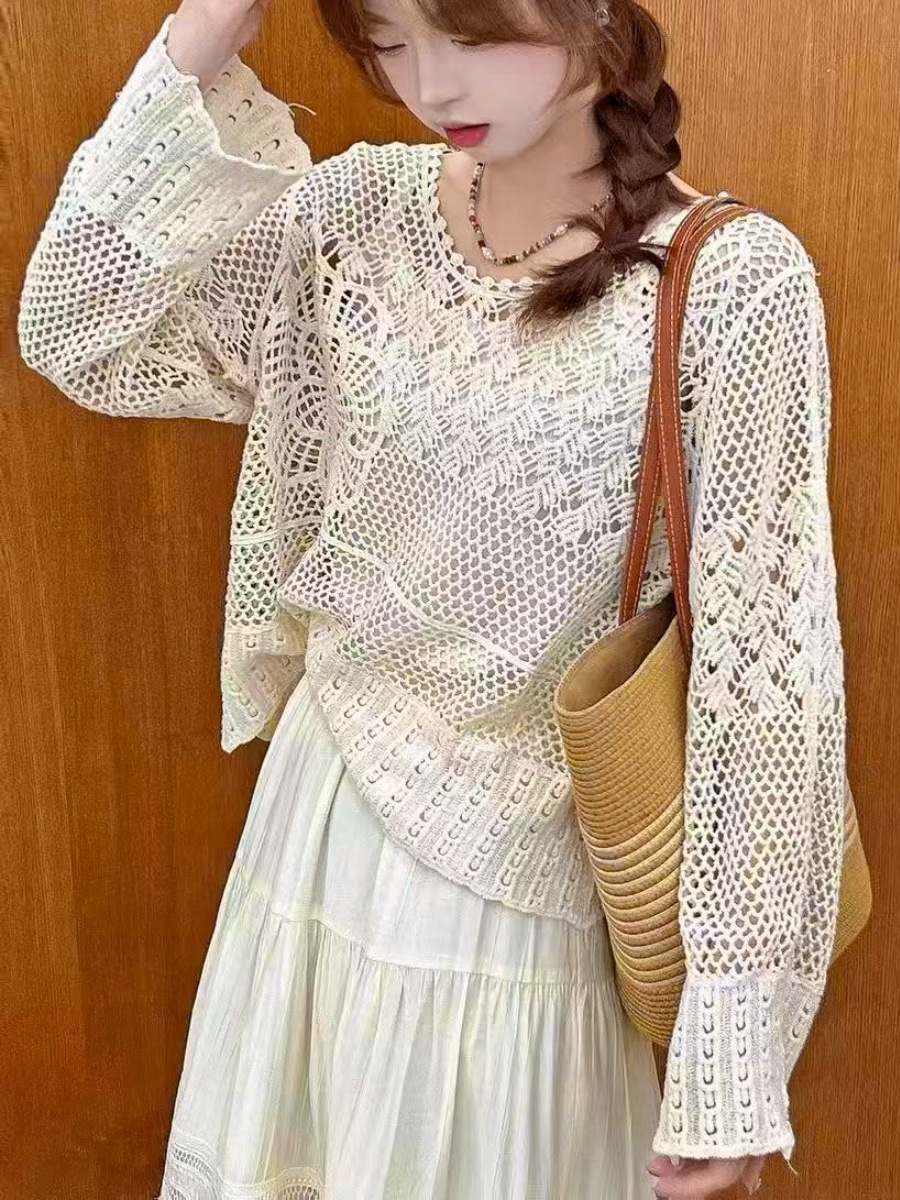 자수 크로 셰 뜨개질 중공 접합 쉬폰 긴팔 자외선 차단 의류 짧은 풀오버 스웨터 여성 2025 여름 새 스타일스토어 가기
