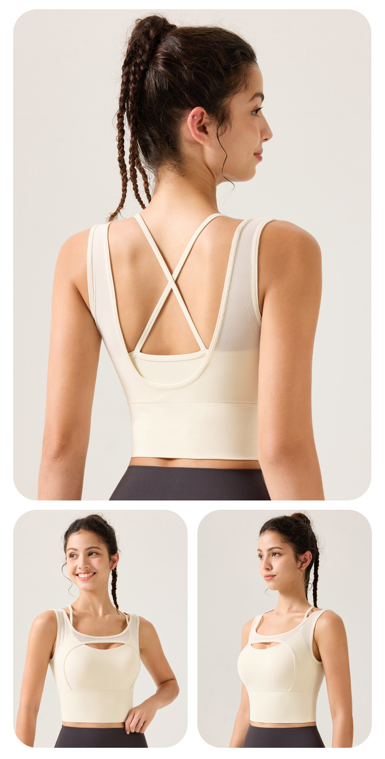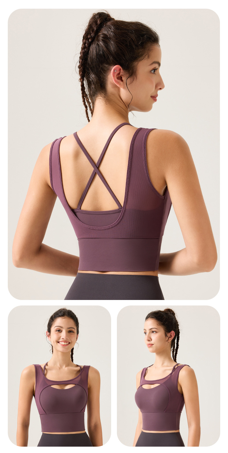 새로운 디자인의 딥 V 네크라인 누드 느낌 스포츠 브라, 봄철 메쉬 소재, 섹시한 얇은 스트랩, 크로스백 디자인, 충격 방지, 푸쉬업 기능을 갖춘 여성용 스포츠 브라