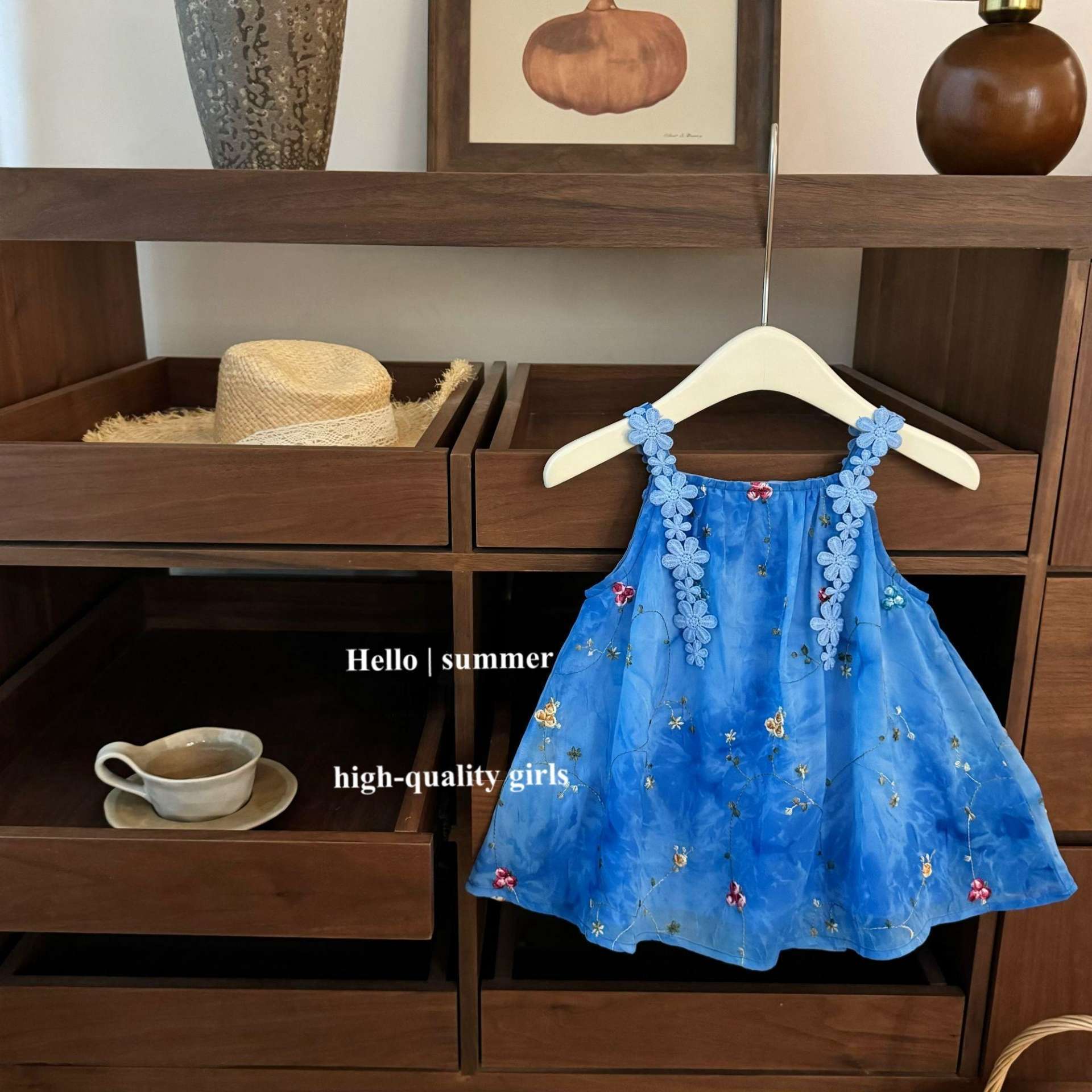 여아용 오리지널 서스펜더 스커트! 아기 소녀의 매우 아름다운 흰색과 파란색 입체 꽃 자수 조끼 스커트 탑 도매
