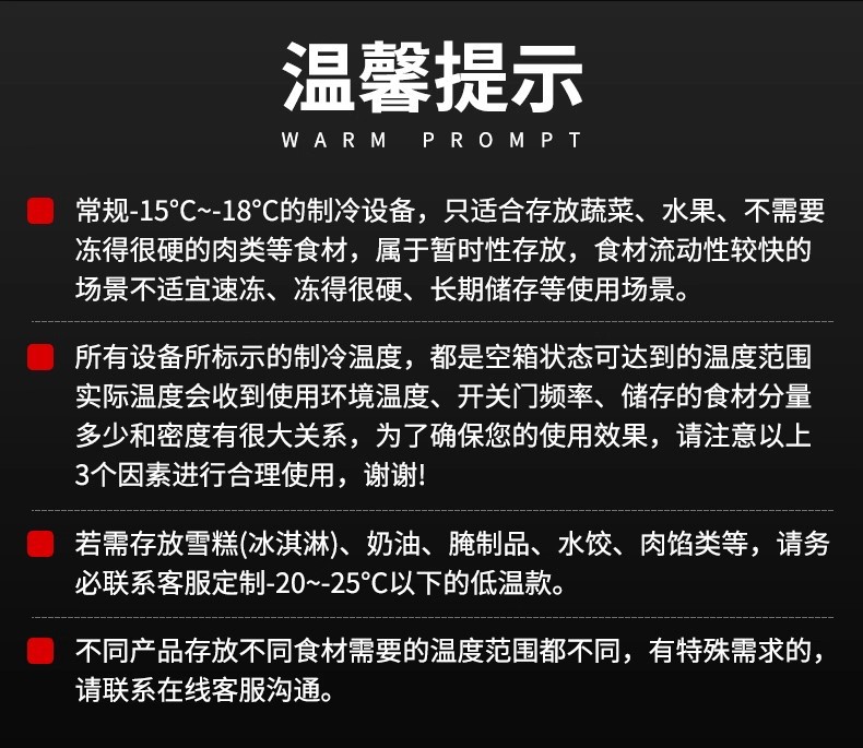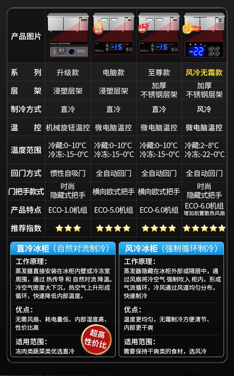 • 냉동-22 ℃ .【공냉식 및 성에 없음】저온 급속 냉동 + 주파수 변환 에너지 절약 50% + 마이크로컴퓨터 온도 제어 + 스테인레스 스틸 + 중간 빔 가열 + 자동 리바운드 도어