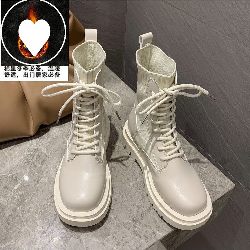 두꺼운 밑창의 작은 가죽 신발 마틴 부츠 여성 가을, 겨울 영국 스타일 2023 니트 화이트 부츠 플러스 벨벳 짧은 부츠 여성