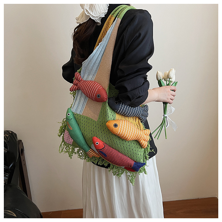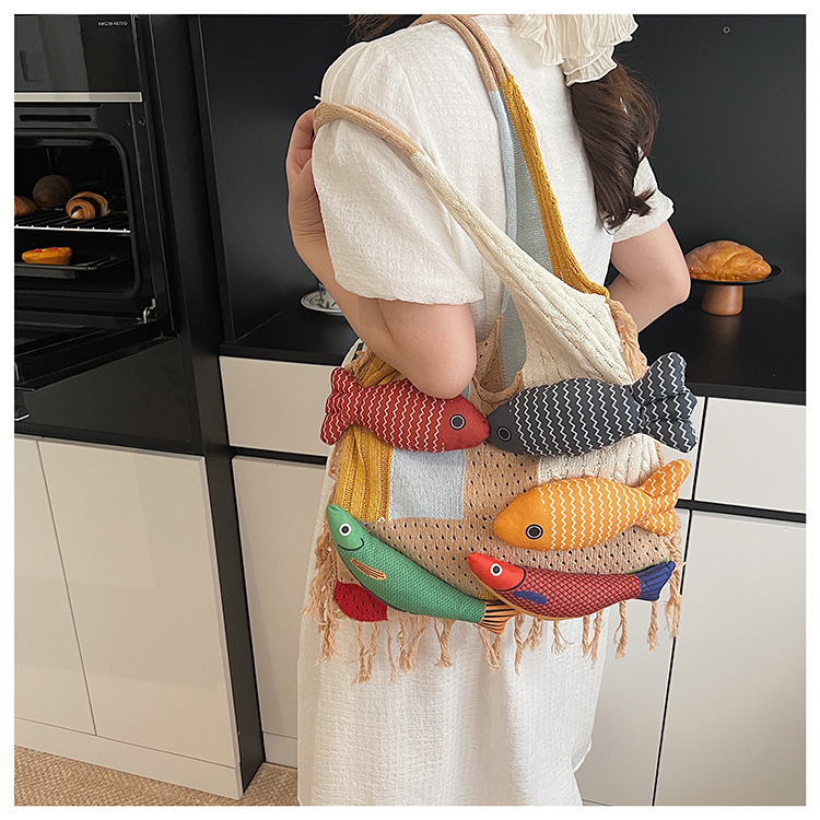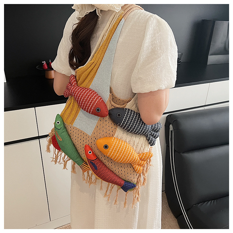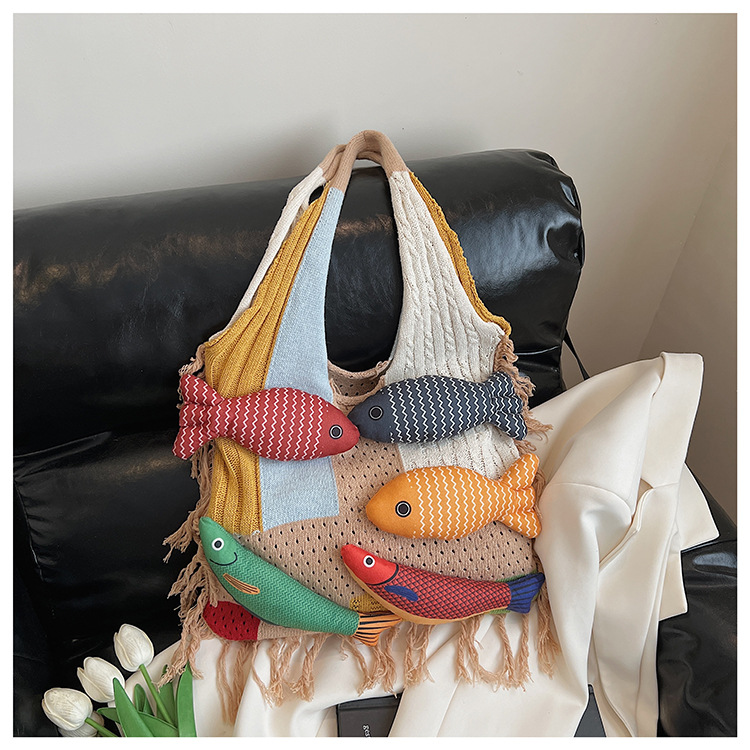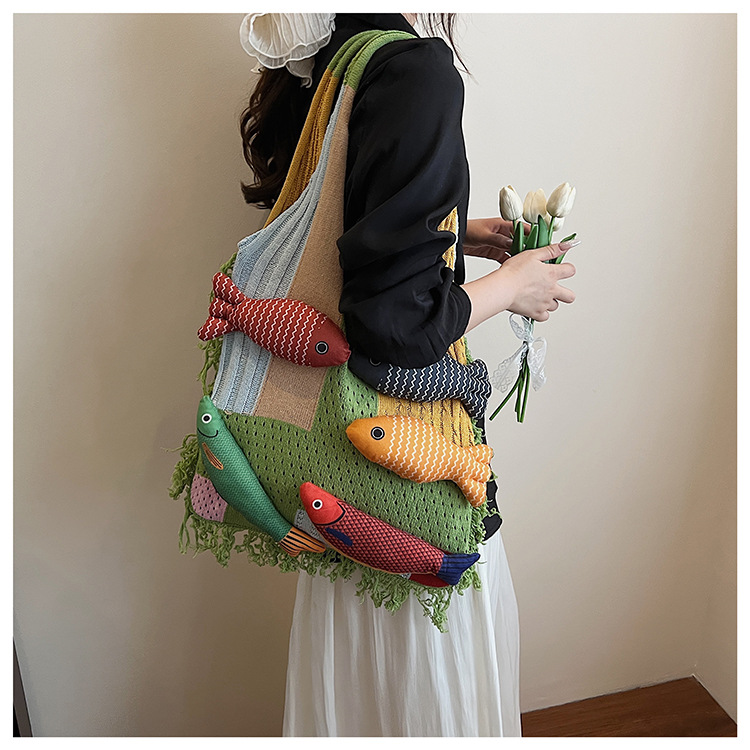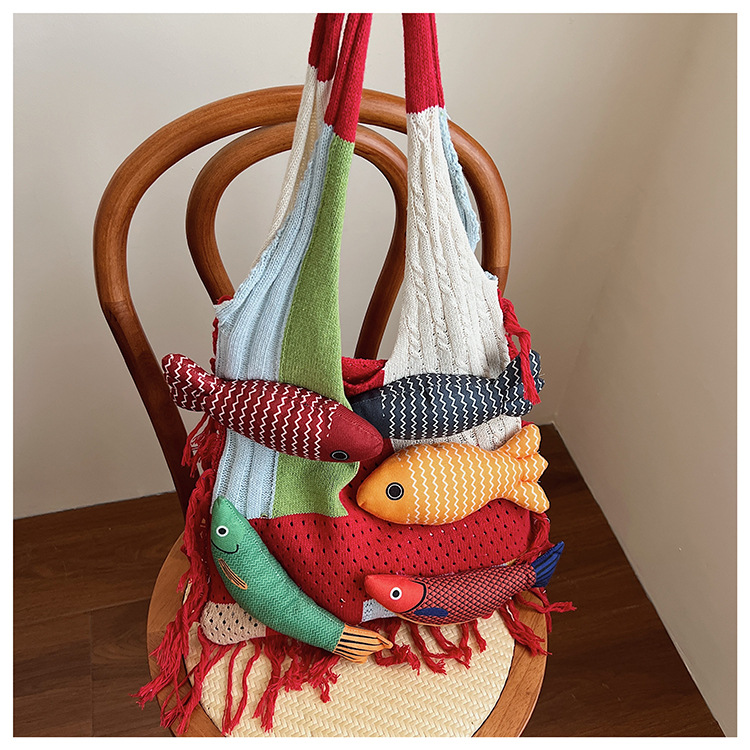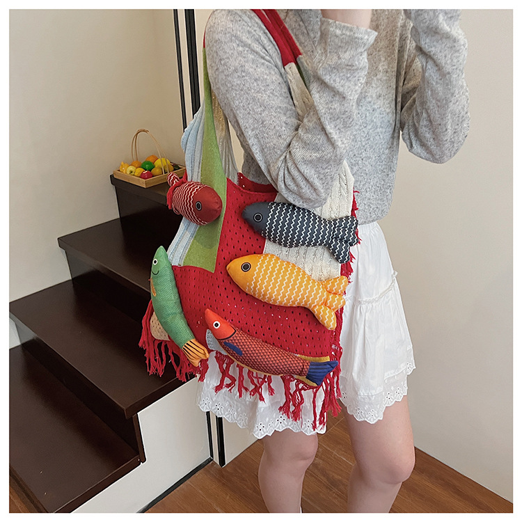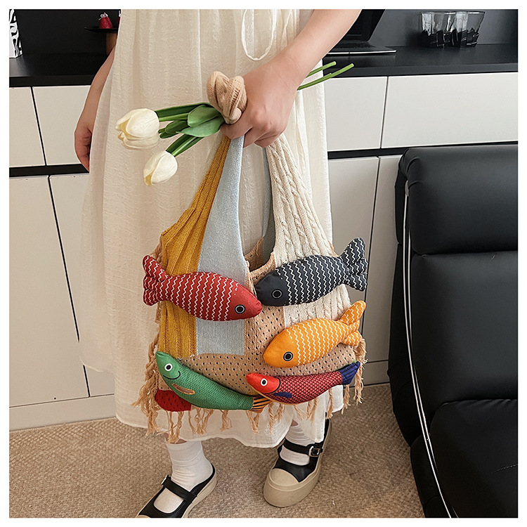 개성있는 디자인의 토트백, 레이지 스타일의 니트 핸드백, 물고기가 많아요, 대용량 손으로 짠 여성용 숄더백