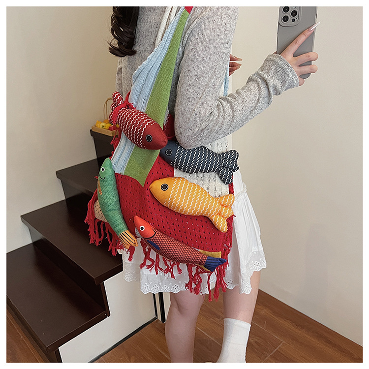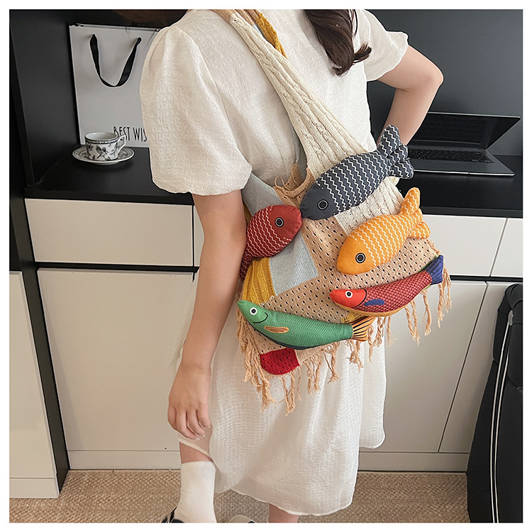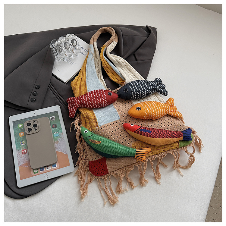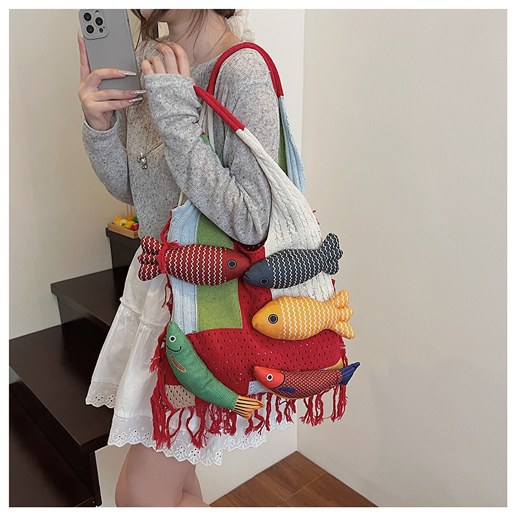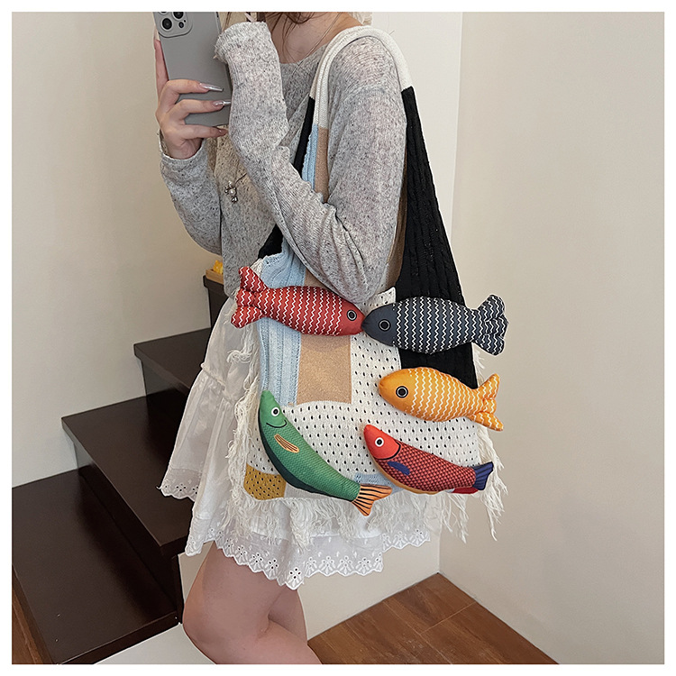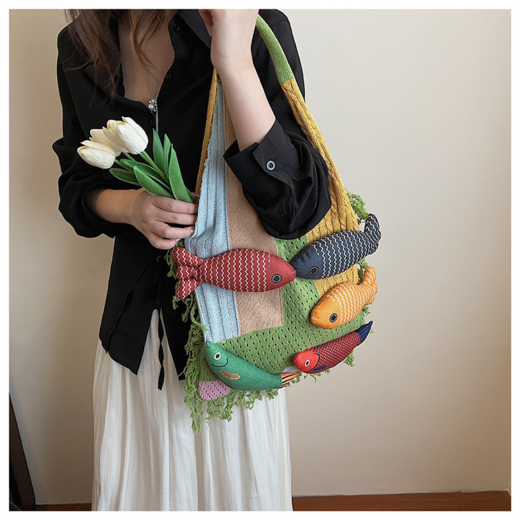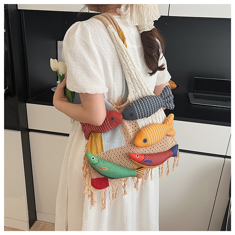 개성있는 디자인의 토트백, 레이지 스타일의 니트 핸드백, 물고기가 많아요, 대용량 손으로 짠 여성용 숄더백