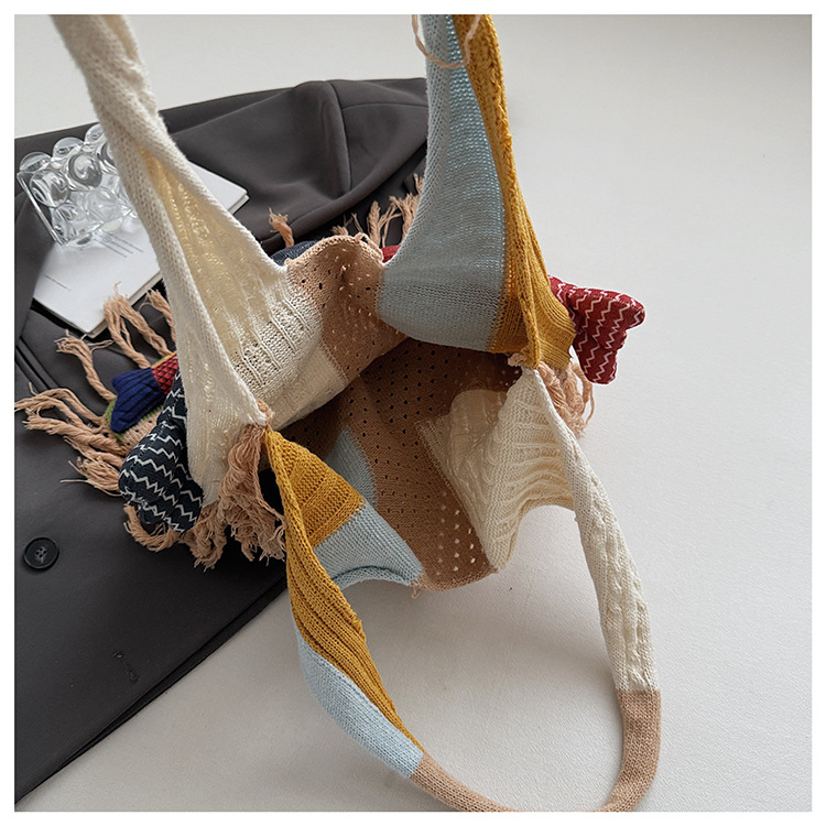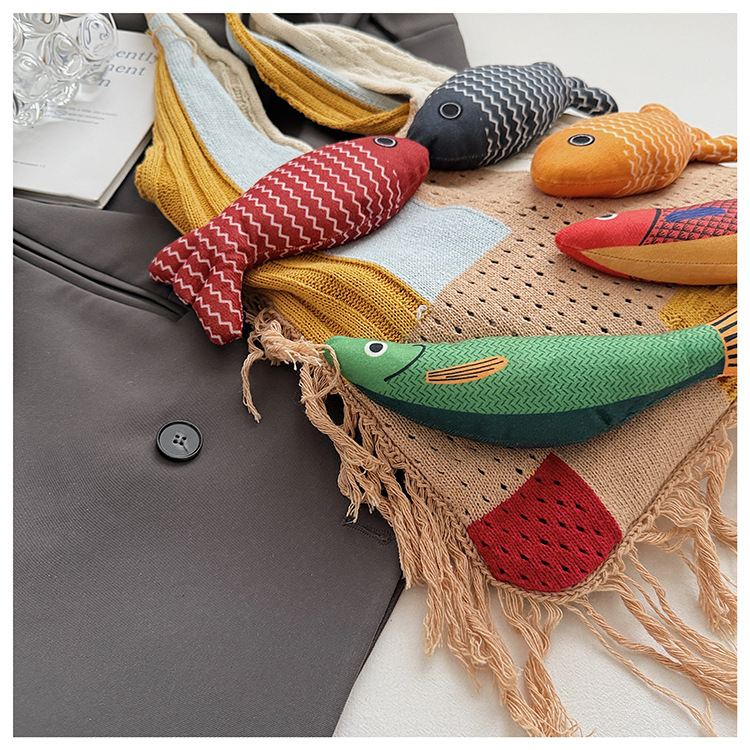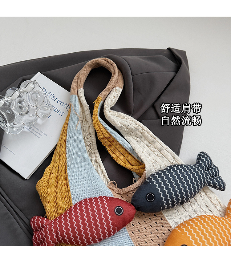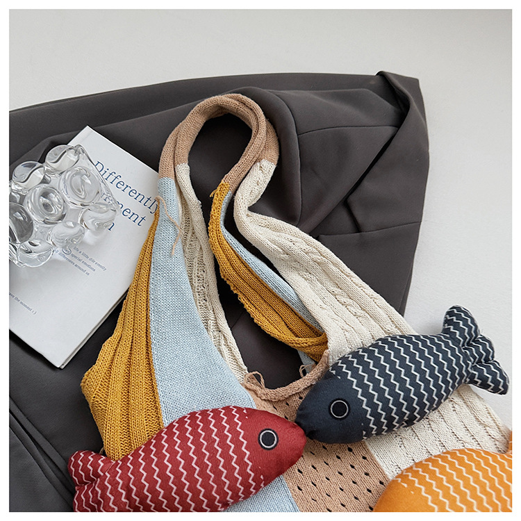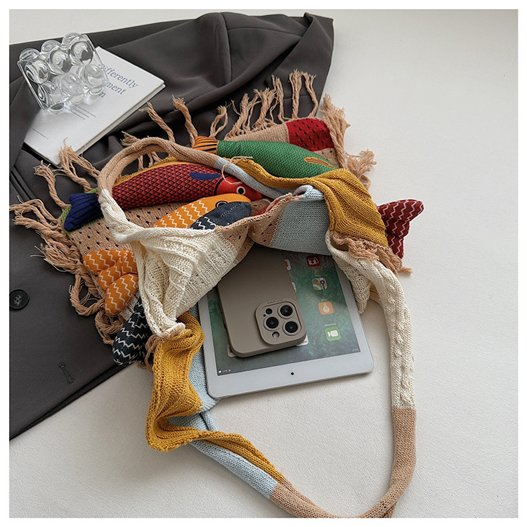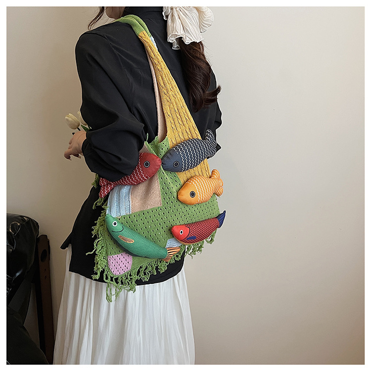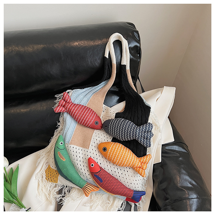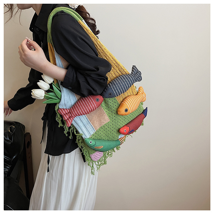 개성있는 디자인의 토트백, 레이지 스타일의 니트 핸드백, 물고기가 많아요, 대용량 손으로 짠 여성용 숄더백