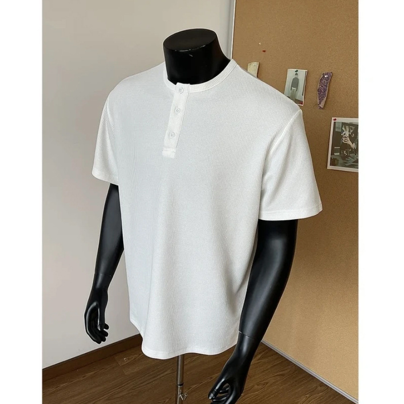 아메리칸 헨리 칼라 반팔 남성 여름 슬림핏 라이트 그레이 오른쪽 어깨 티셔츠 클린핏 와플 바닥 셔츠
