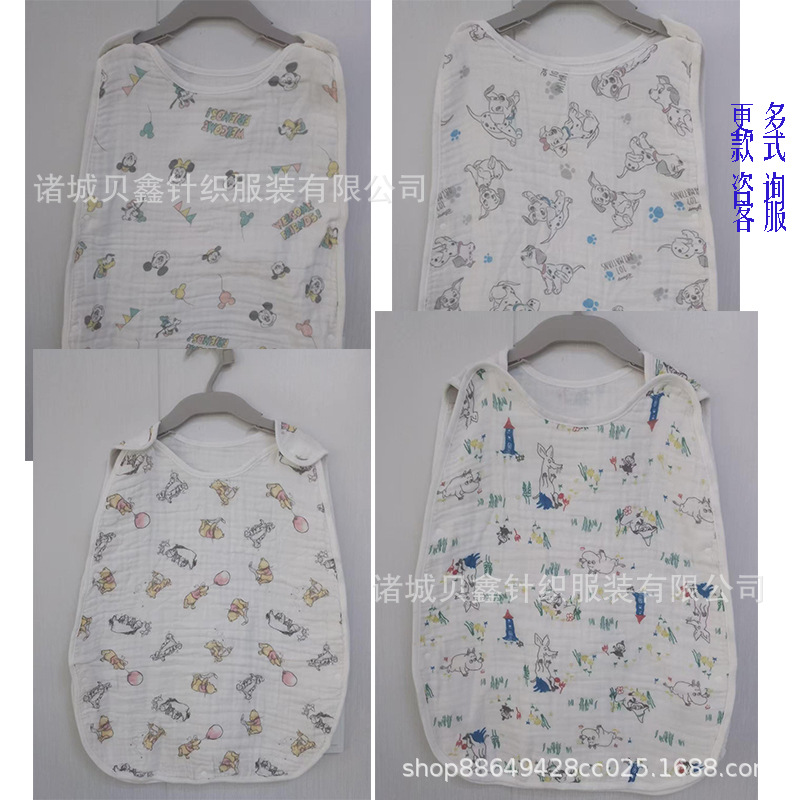4层多层纱布马甲睡袋,有大小码,图案有很多种,面料用棉纱布,柔软吸水透气,纯日单出口剩余尾货,环保健康。由于是出口订单剩余,如有出现瑕疵如:破洞、抽丝、印花不良、做工不良等瑕疵问题属于正常,介意慎拍,不支持做为退换货理由,如强制退货,永不交易。本链接标价为随机混批不挑色价格,如有需要挑款指定可咨询客服,以客服报价为准,与本链接标价无关。