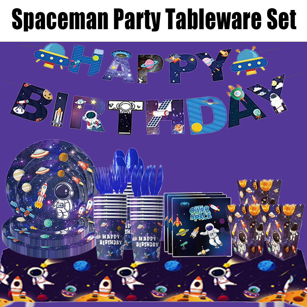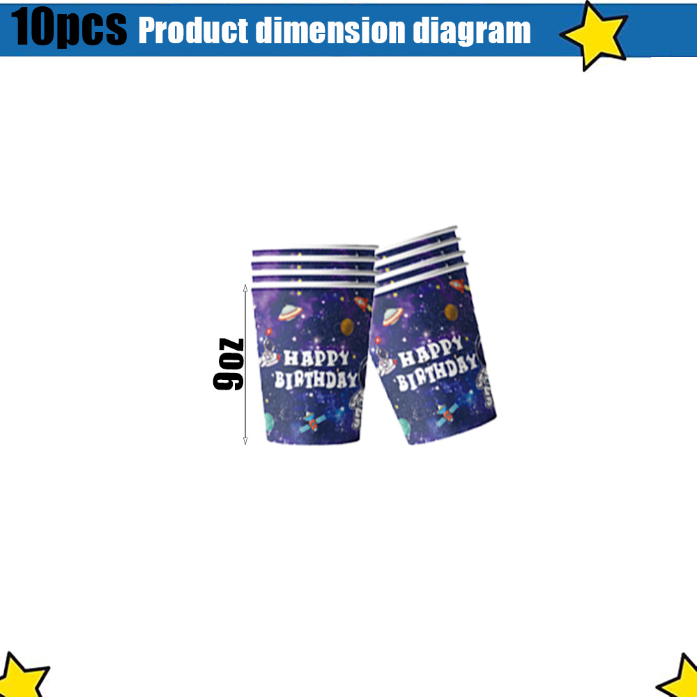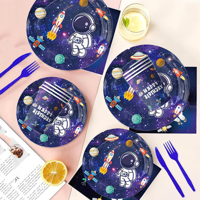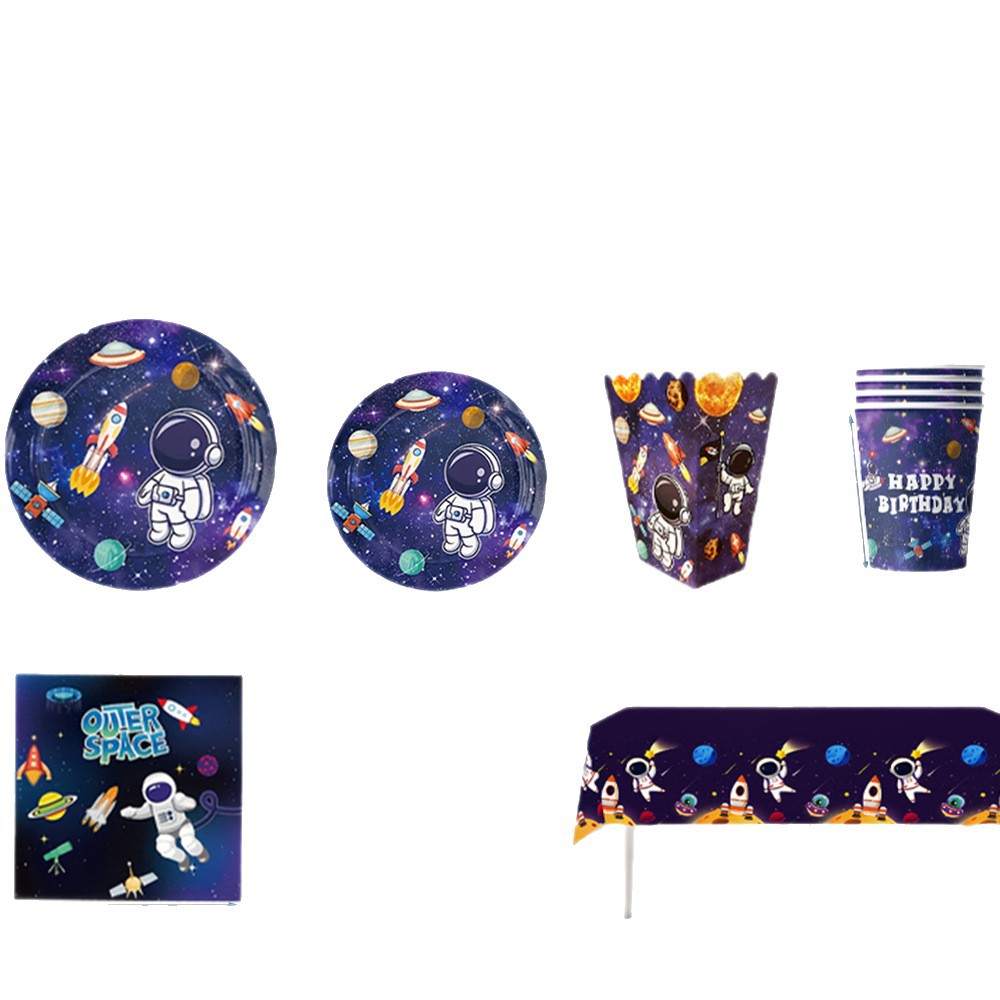 국경 간 인기 판매 우주 비행사 파티 장식 용품 일회용 식기 종이 접시 종이컵 풍선 파티 이벤트 세트