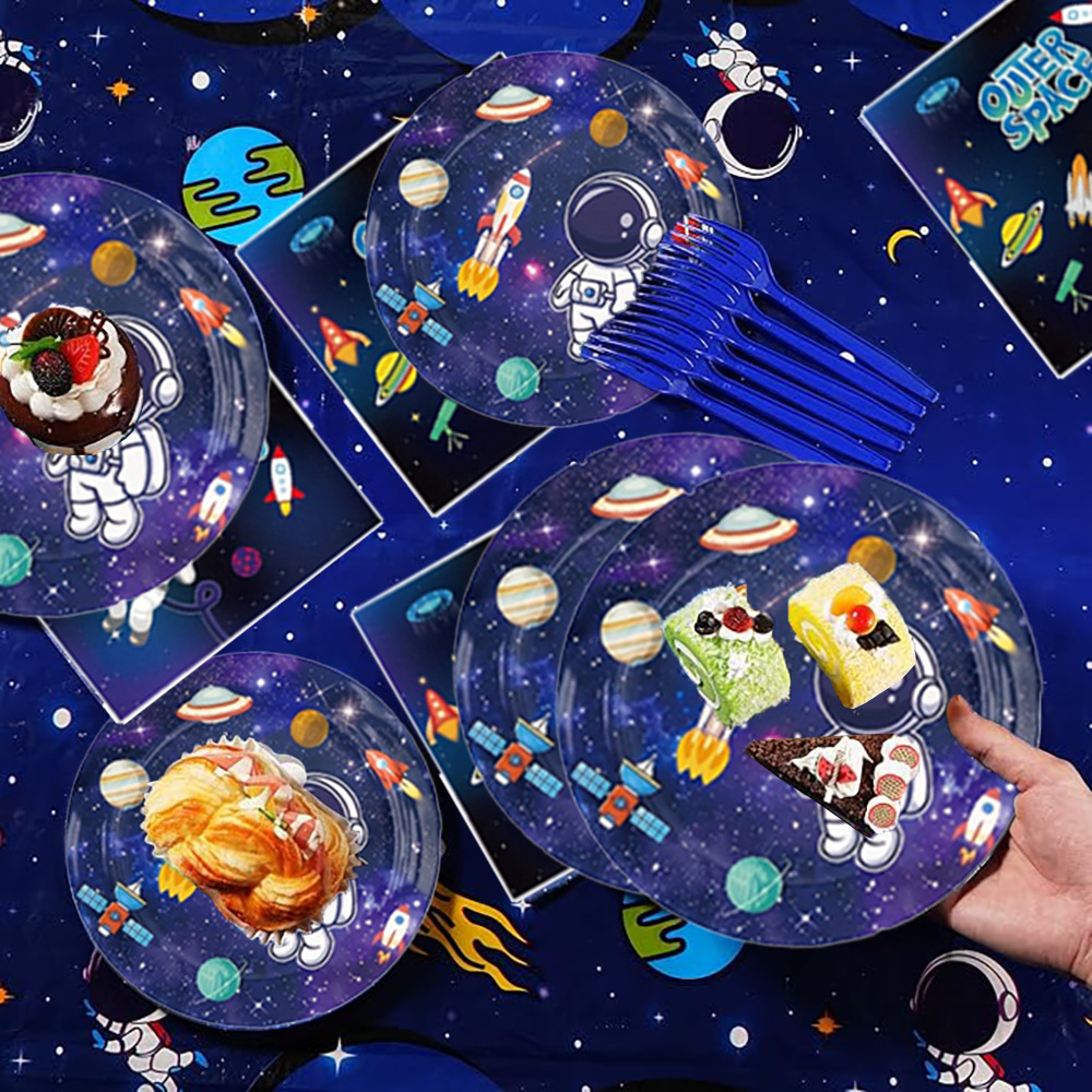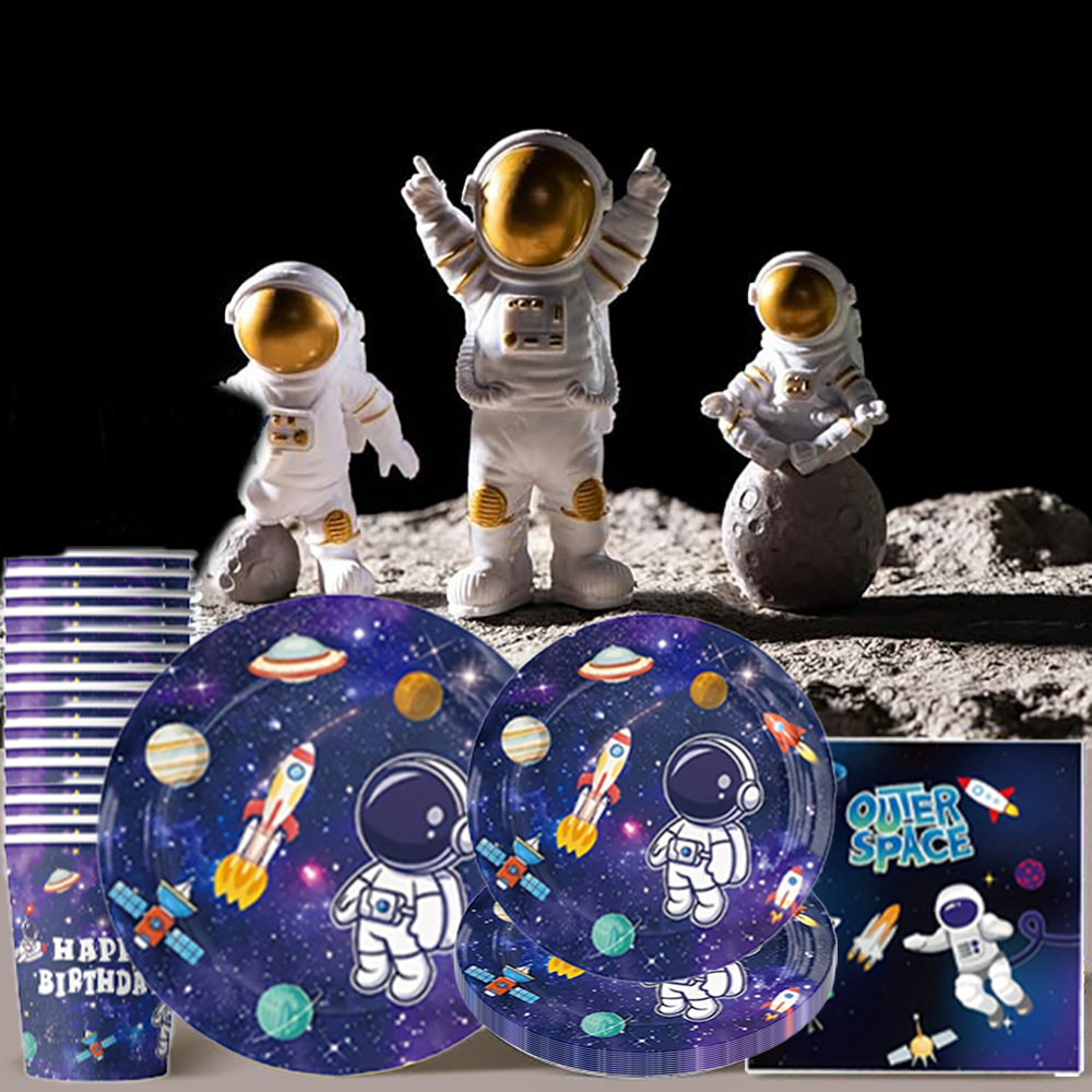 국경 간 인기 판매 우주 비행사 파티 장식 용품 일회용 식기 종이 접시 종이컵 풍선 파티 이벤트 세트스토어 가기