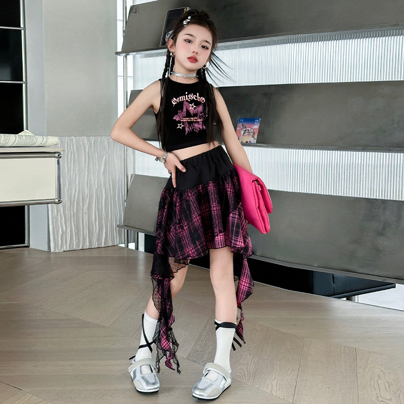 여자 반팔 스커트 정장 여름 2025 새로운 스타일 여자 거즈 스커트 큰 어린이 여름 짧은 치마 투피스 세트