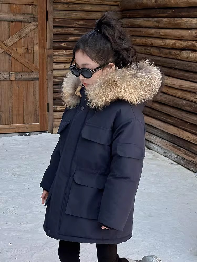 [탈부착 가능한 큰 모피 칼라] 아동용 플리스 파카 2025 겨울 신상 중대형 아동용 중간 길이 두꺼운 아우터스토어 가기