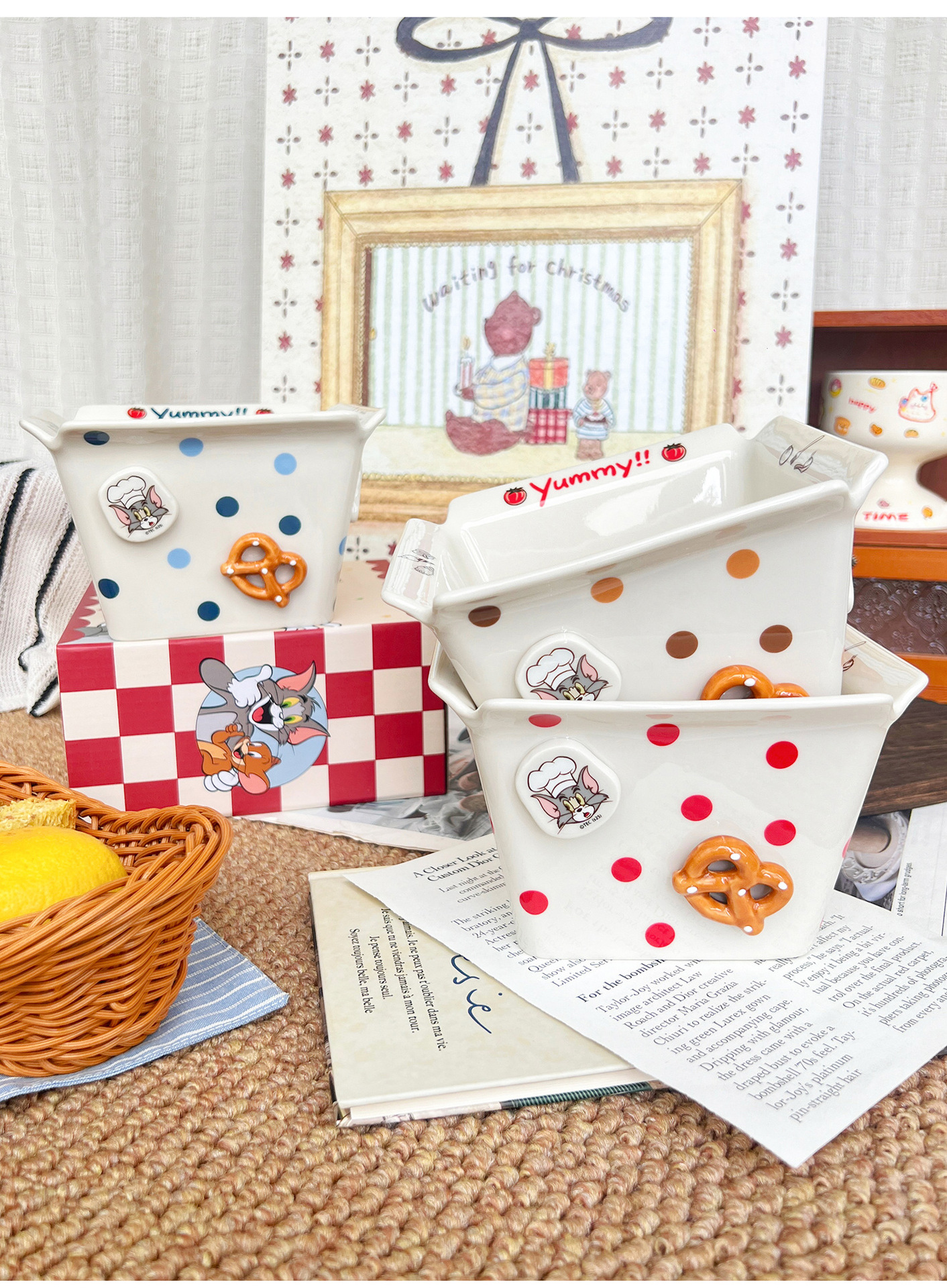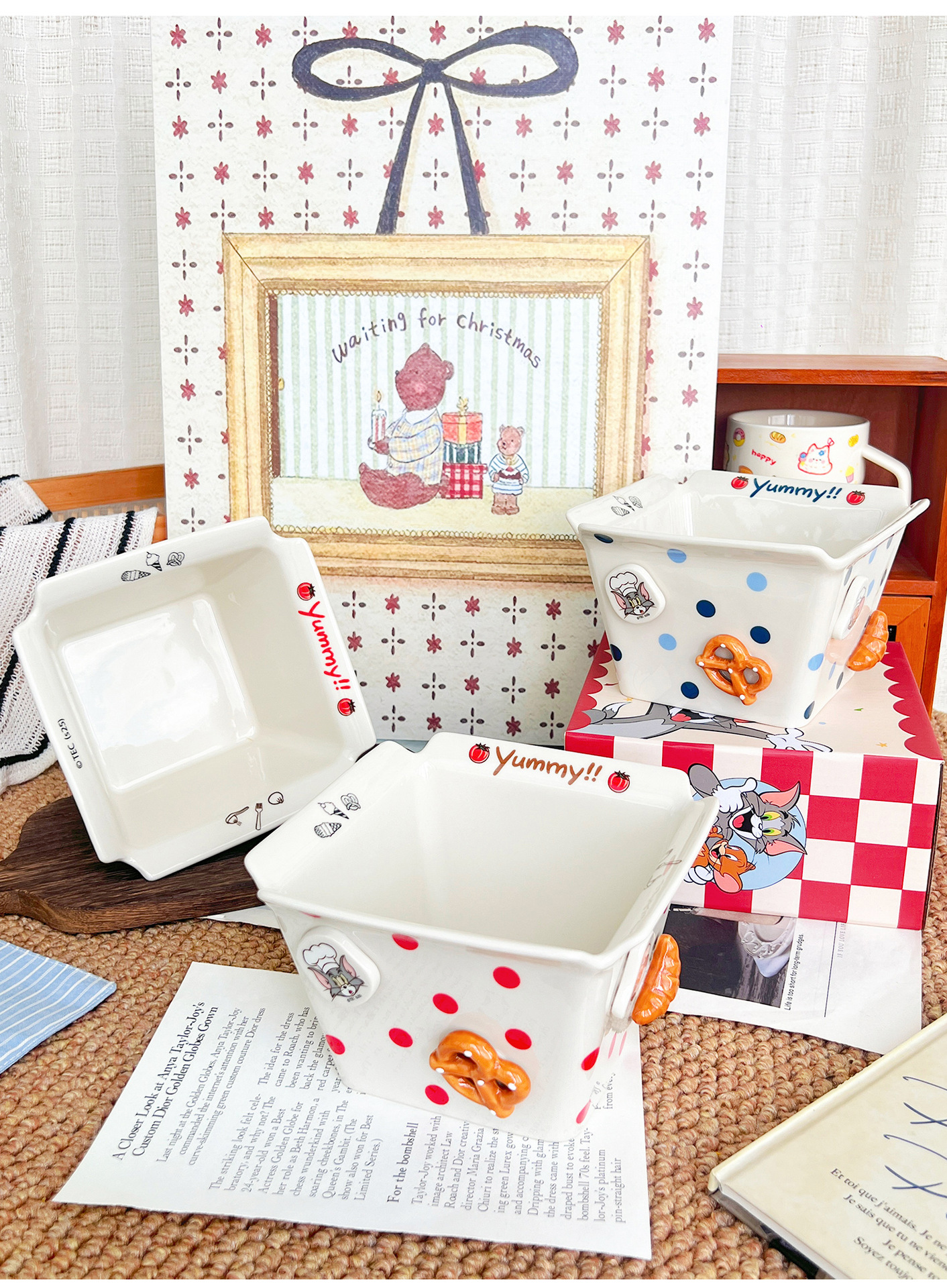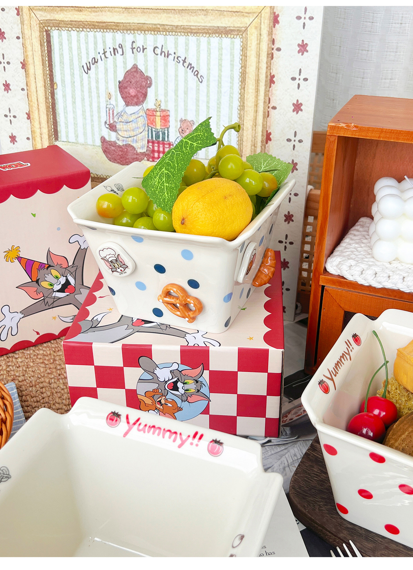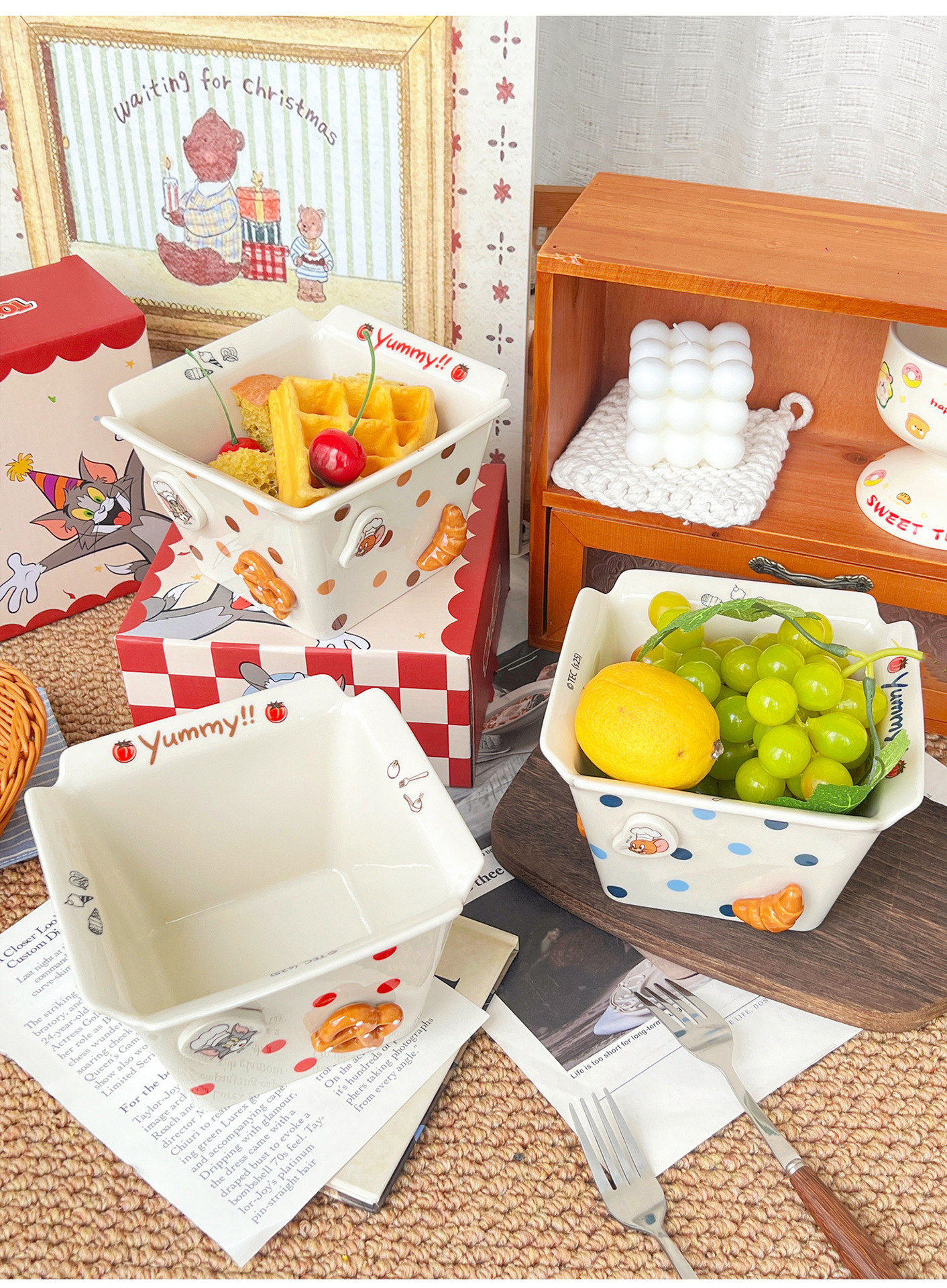 톰과 제리 주변 세라믹 감자 튀김 그릇 커플 팝콘 과일 샐러드 그릇 고급스러운 사각형 그릇 대용량