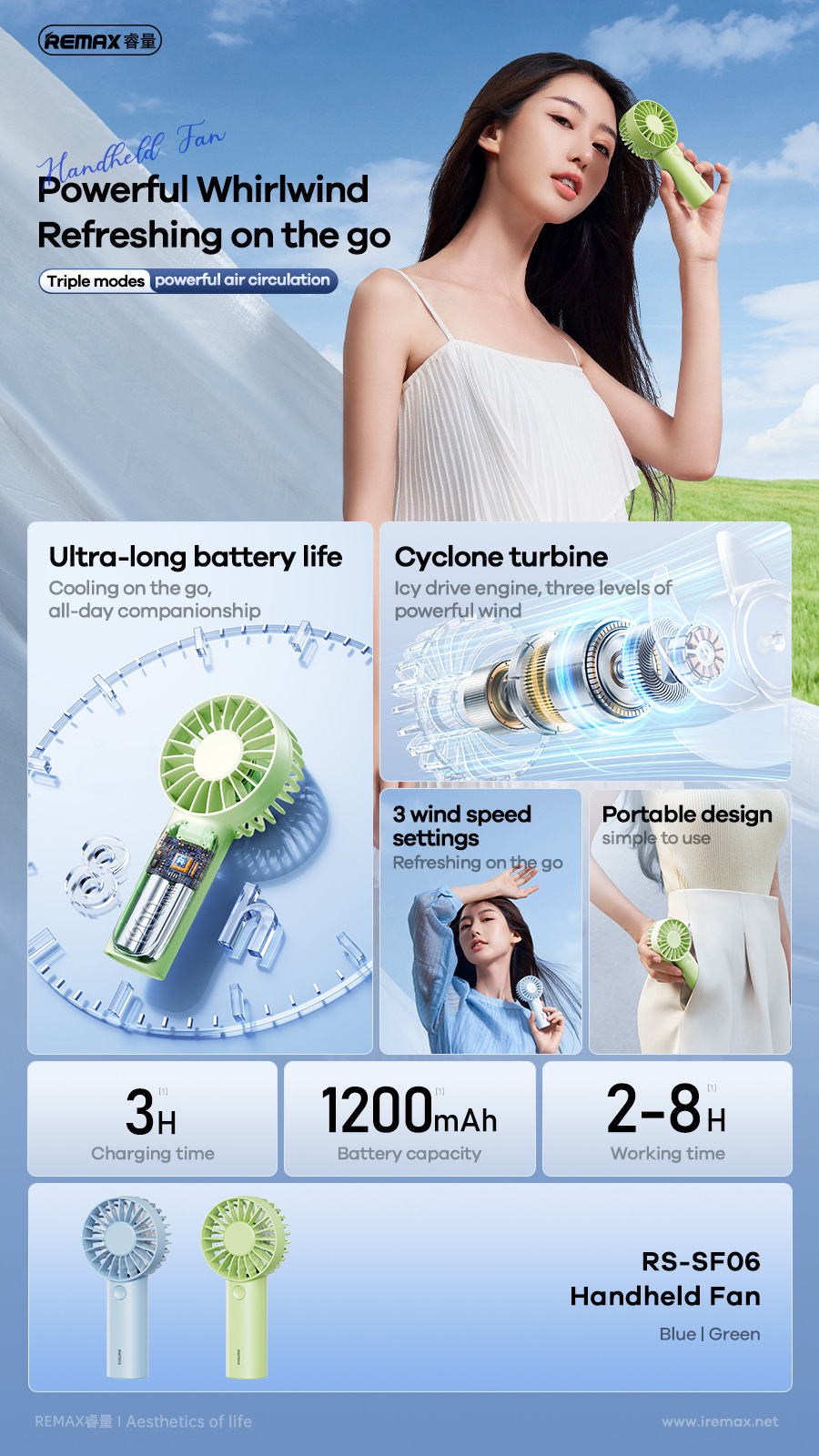 REMAX 휴대용 USB 소형 팬 미니 긴 배터리 수명 3단 순환 강풍 휴대용 포켓 소형 팬 SF06
