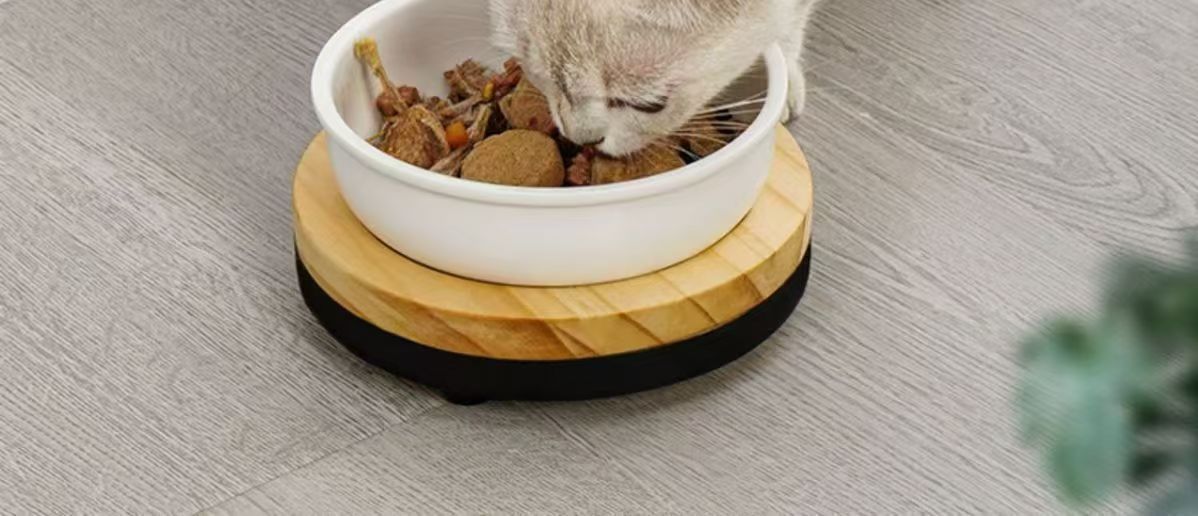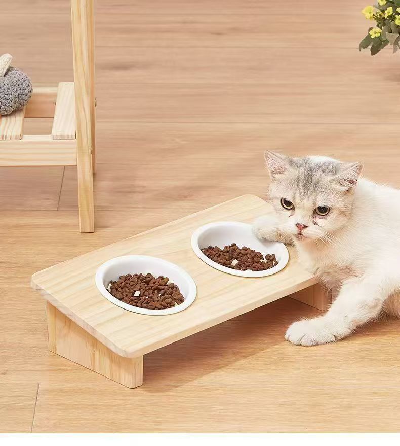 • 넘어짐 방지 소나무 그릇걸이 + 세라믹 고양이 그릇 세트 [이중그릇 조합]