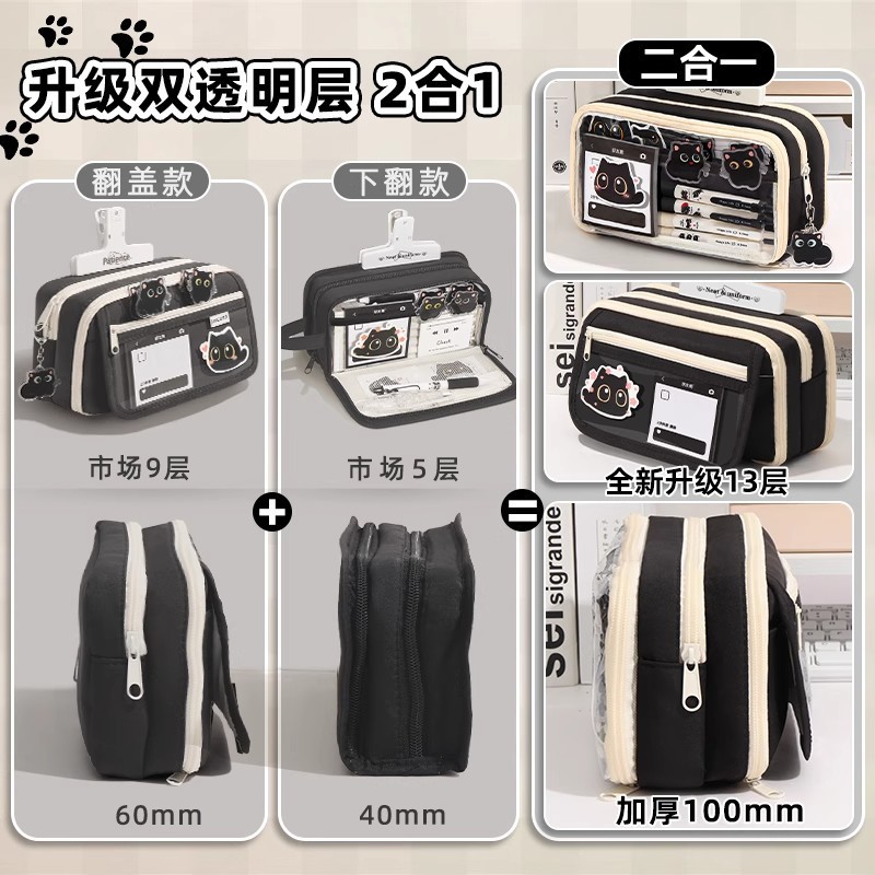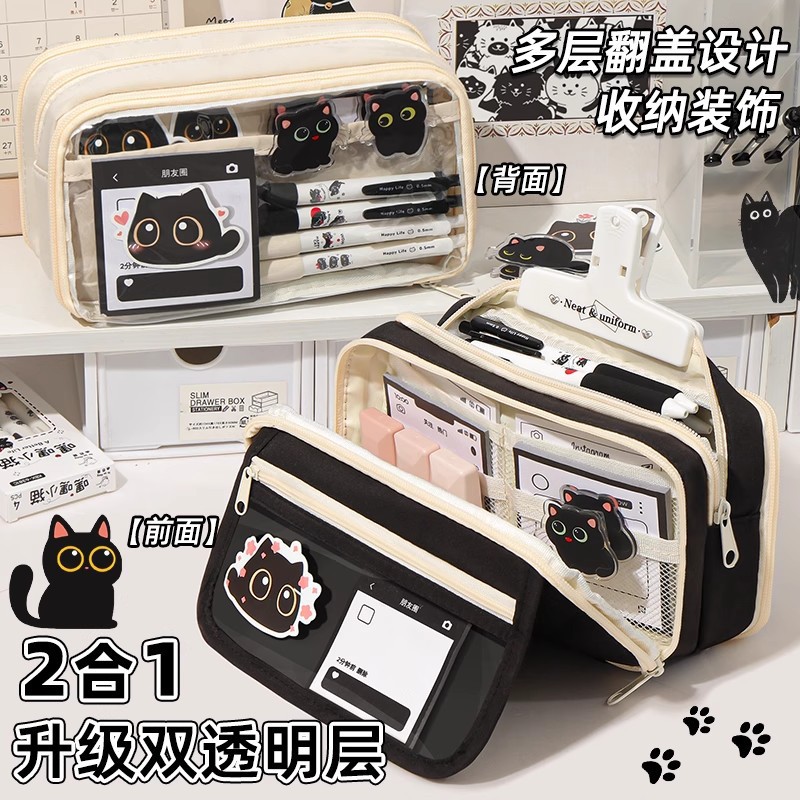 고양이 필통, 예쁜 디자인, 대용량, 인스 스타일 투명 한국형 수납 가방, 학습 및 사무용 쿨 블랙 스타일 문구 가방