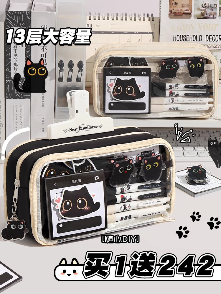 고양이 필통, 예쁜 디자인, 대용량, 인스 스타일 투명 한국형 수납 가방, 학습 및 사무용 쿨 블랙 스타일 문구 가방스토어 가기