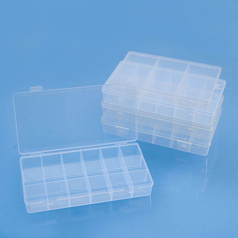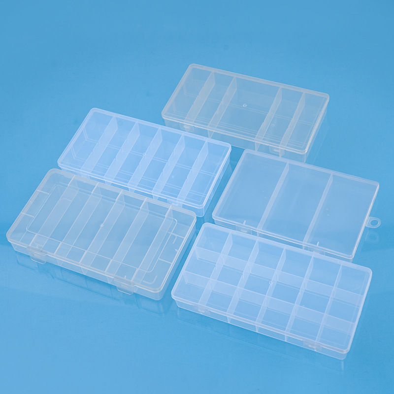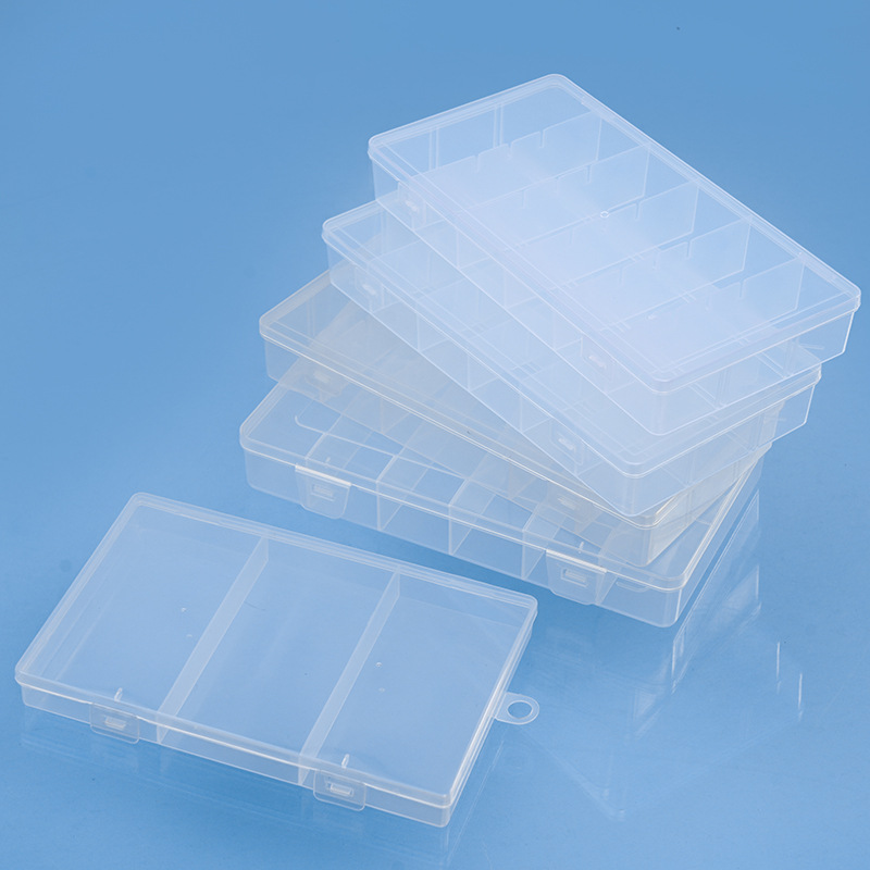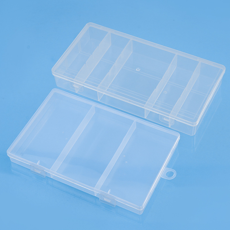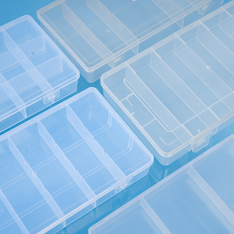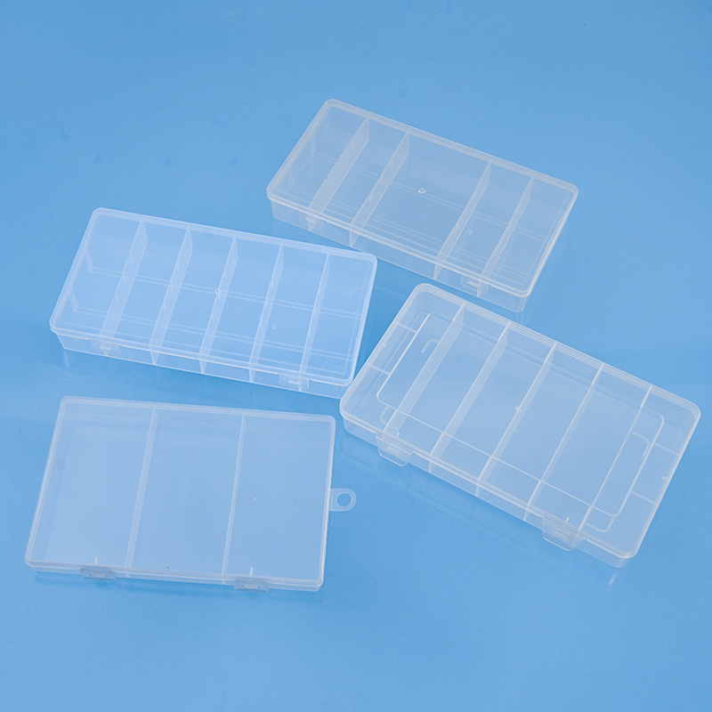 6칸의 직사각형 보석 도구 상자가 있는 투명 PP 플라스틱 상자, 낚시 장비 샘플 부품 상자, 매니큐어 포장 보관 상자