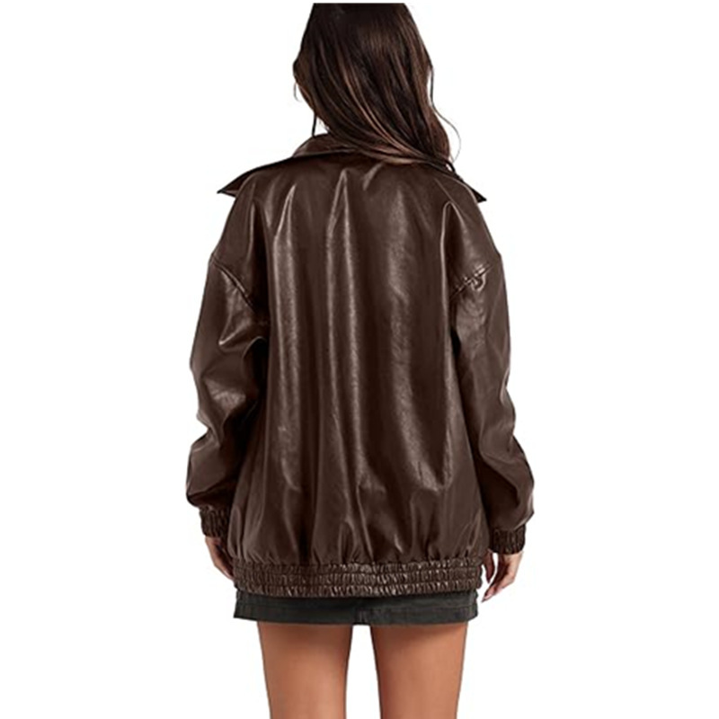 2025 새로운 Amazon 독립 스테이션 인기 PU 가죽 자켓 여성용 긴 소매 옷깃 지퍼 사이드 포켓 캐주얼 자켓