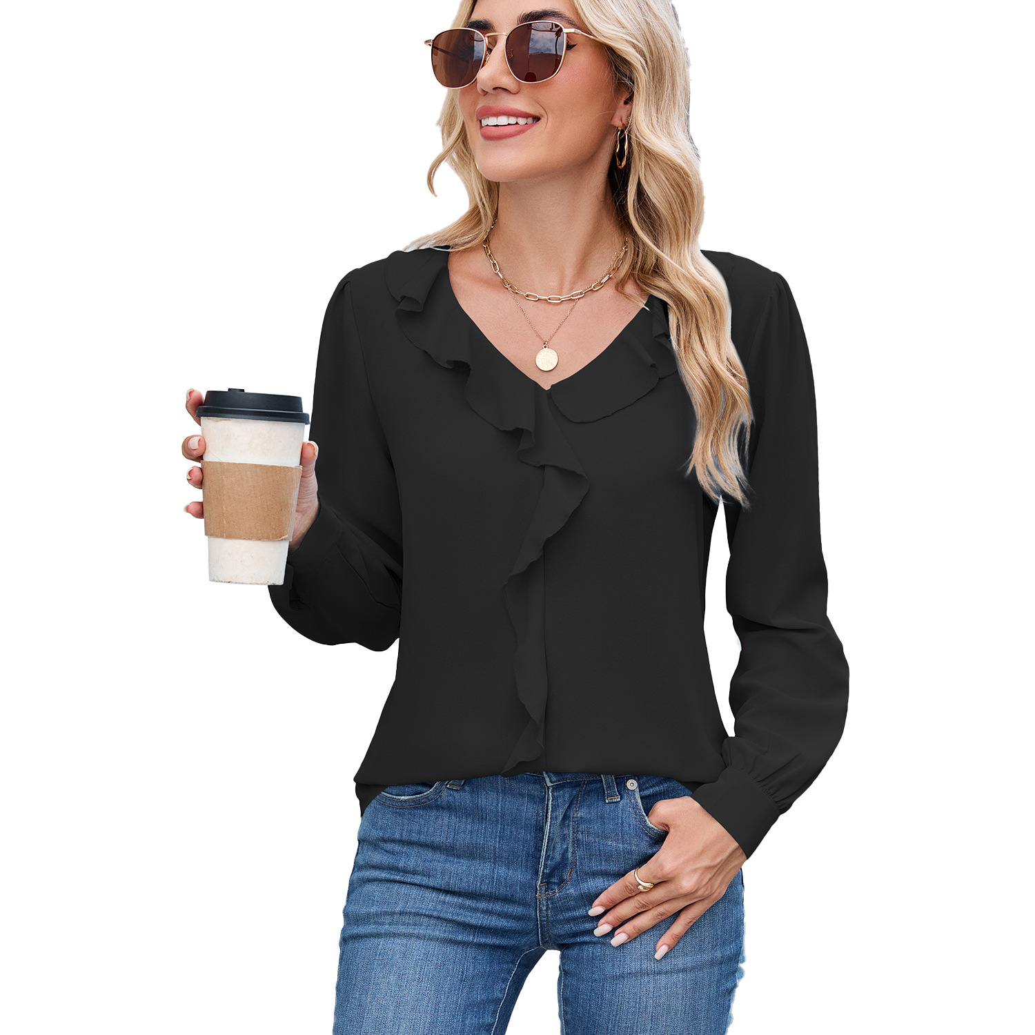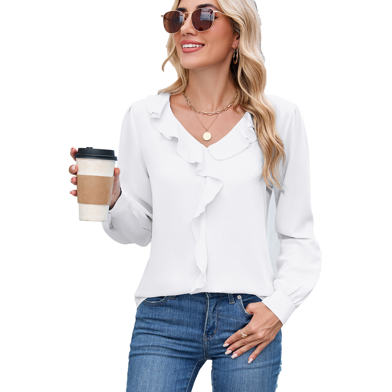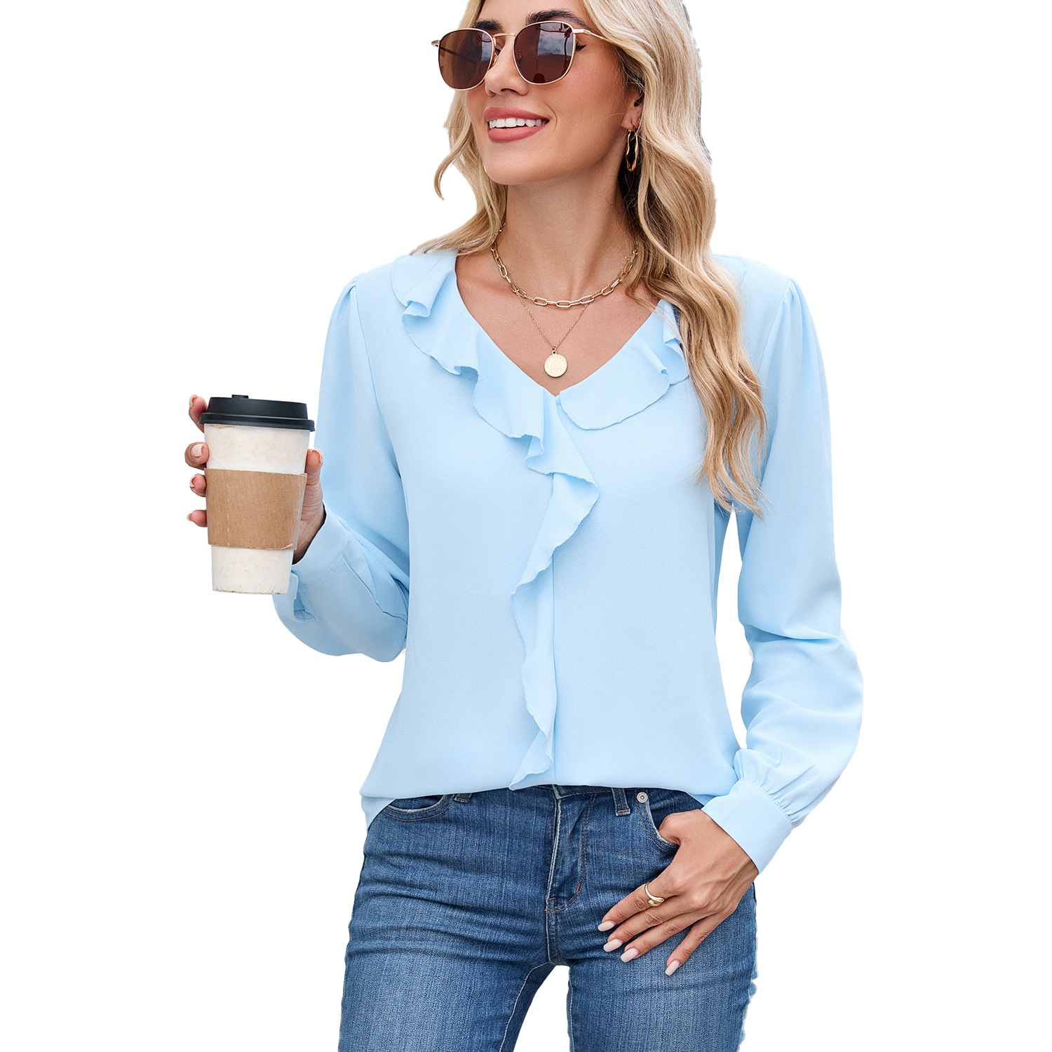 아마존 유럽과 미국의 국경 간 대외 무역 2025 쉬폰 셔츠 긴팔 V 넥 주름 프릴 여성 셔츠 탑스토어 가기