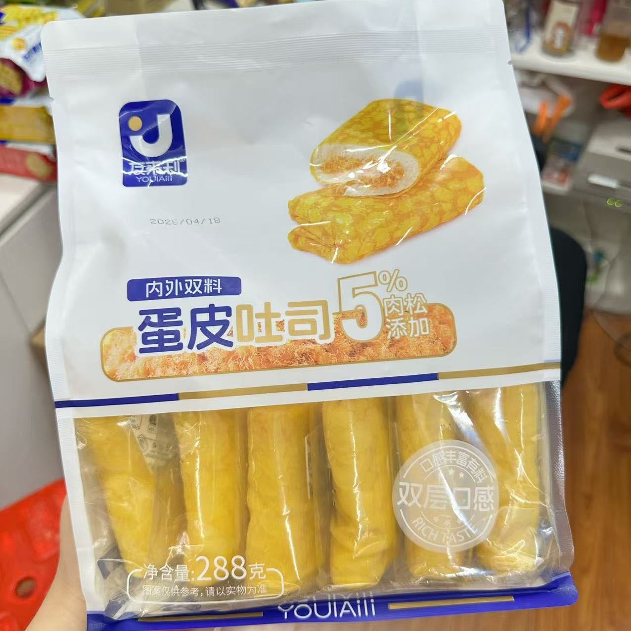 品名:友来利蛋皮吐司面包肉松打开包装满满的鸡蛋香味,蛋皮里面包裹着 肉松,沙拉酱,吐司,多重口味结合在一起简直太美味了,添加健康早餐面包咸味下午茶糕点零食批发288g*12包/箱 整箱批发不混批