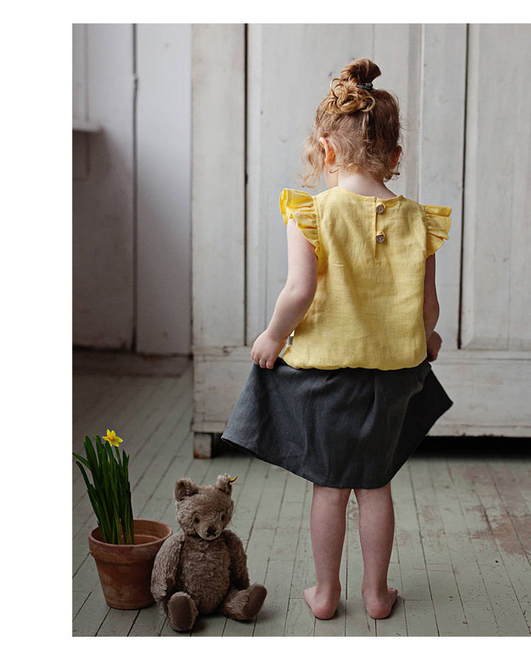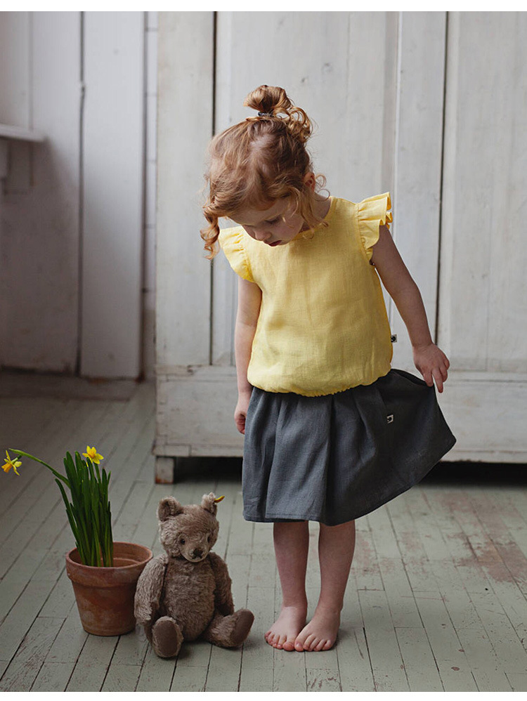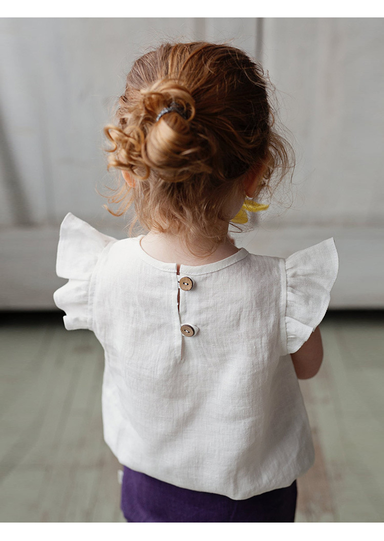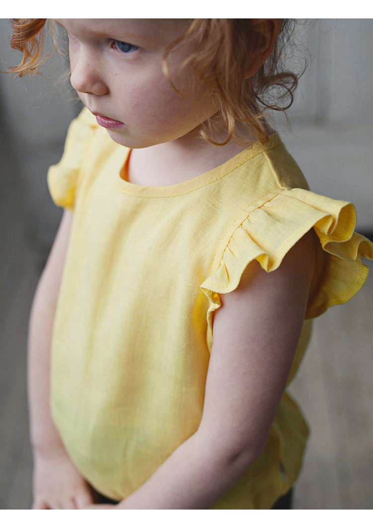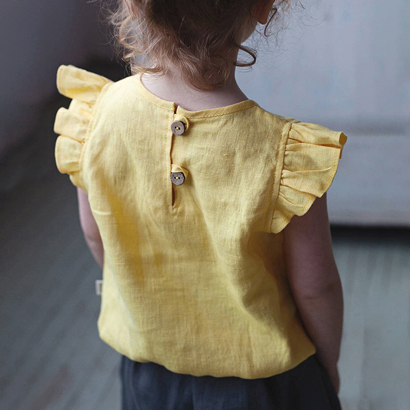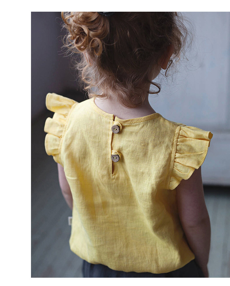 여아 의류 노란색 면 및 린넨 셔츠 여름 반팔 티셔츠 작은 플라잉 슬리브 귀여운 인형 셔츠 유행 린넨 여아상의