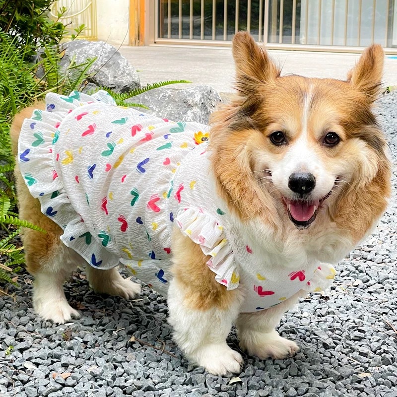 애완용 고양이는 사랑스러운 여름 드레스를 입고 야외에서 끌 수 있습니다. 개와 고양이 용품 코기 개 옷 및 의류