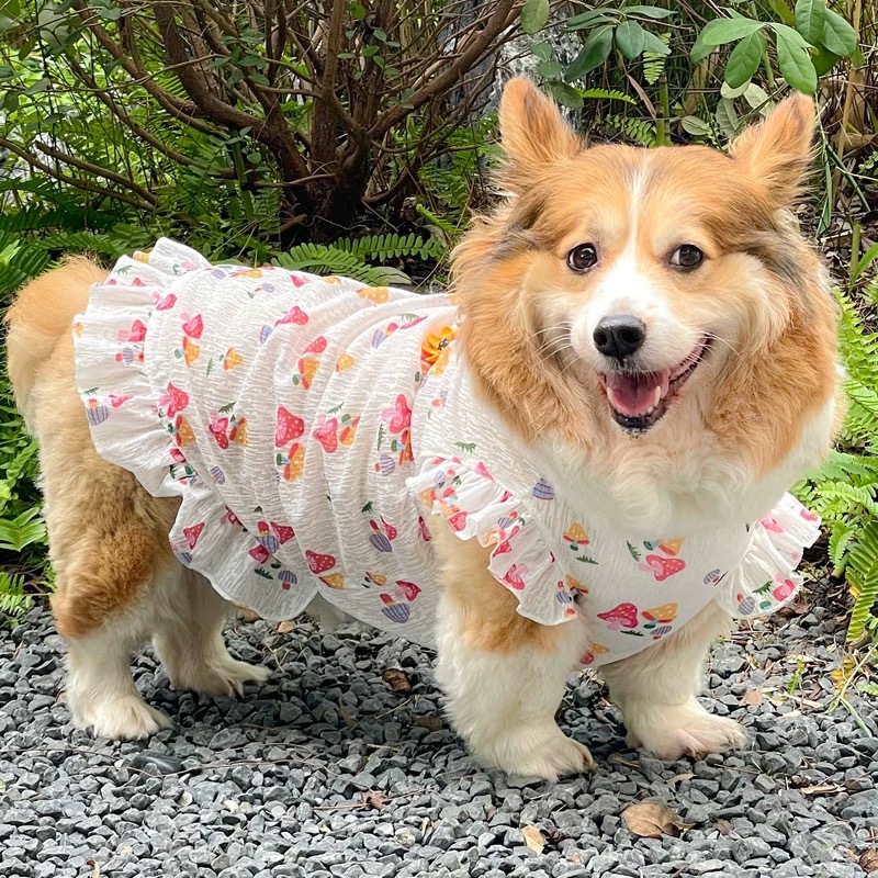 애완용 고양이는 사랑스러운 여름 드레스를 입고 야외에서 끌 수 있습니다. 개와 고양이 용품 코기 개 옷 및 의류스토어 가기
