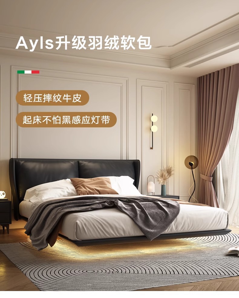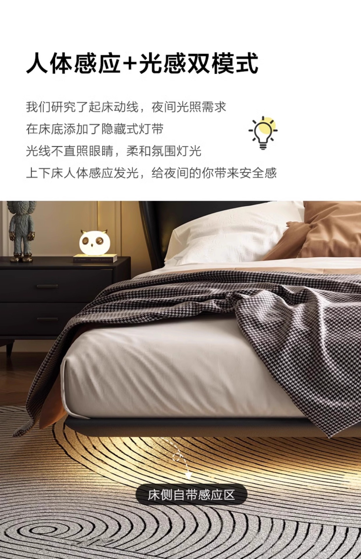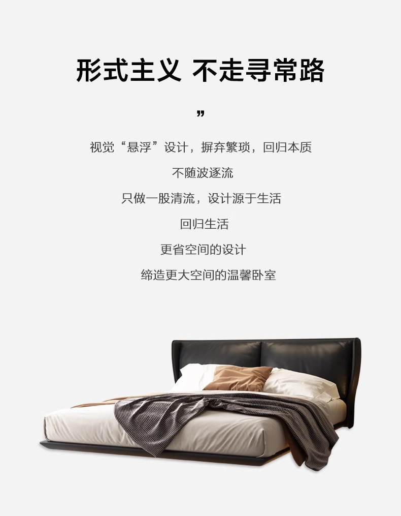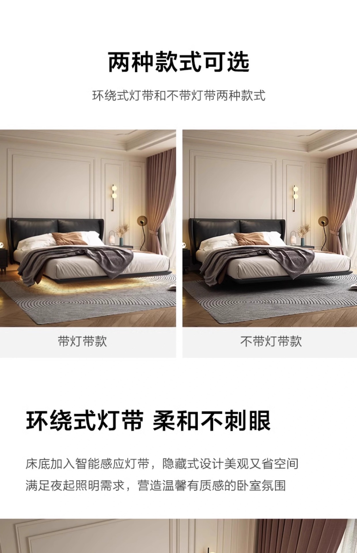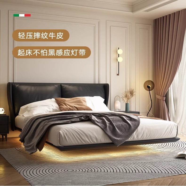 미니멀리스트 서스펜션 가죽 침대, 가벼운 럭셔리, 모던하고 심플한 2025년 신형 더블 침대, 대형 침대, 마스터 침실, 고급스럽고 분위기 있는스토어 가기