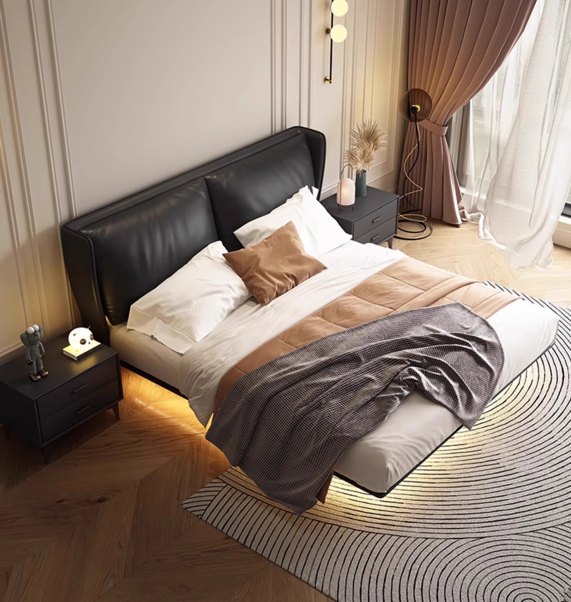 미니멀리스트 서스펜션 가죽 침대, 가벼운 럭셔리, 모던하고 심플한 2025년 신형 더블 침대, 대형 침대, 마스터 침실, 고급스럽고 분위기 있는