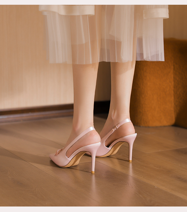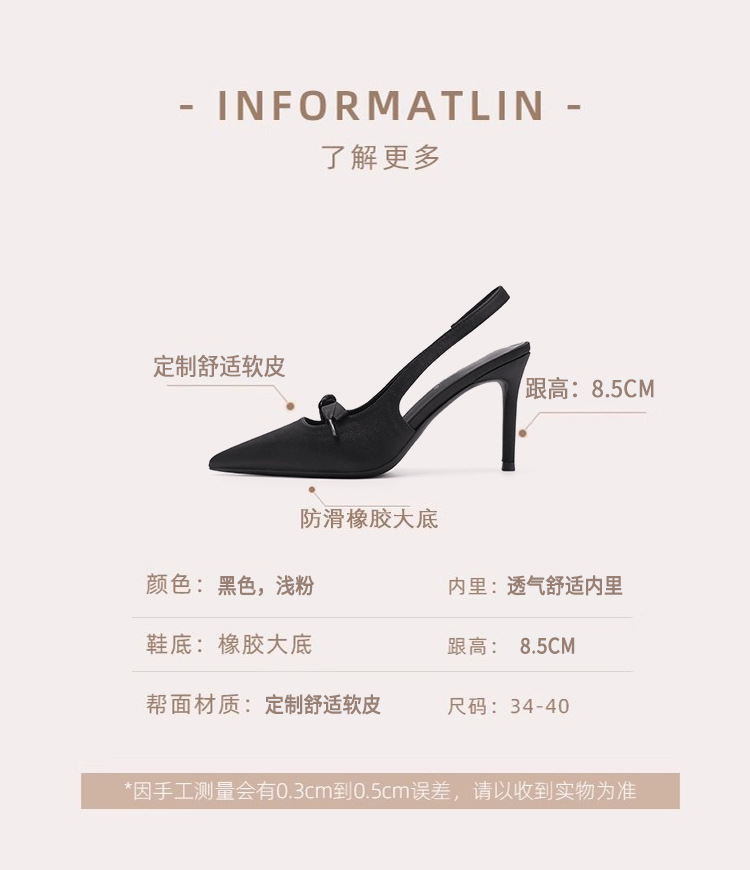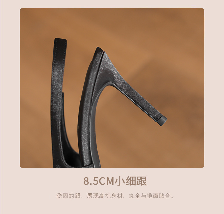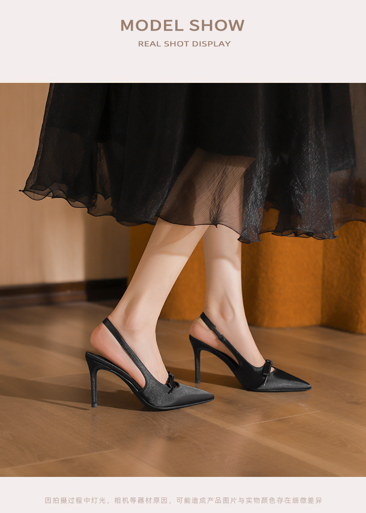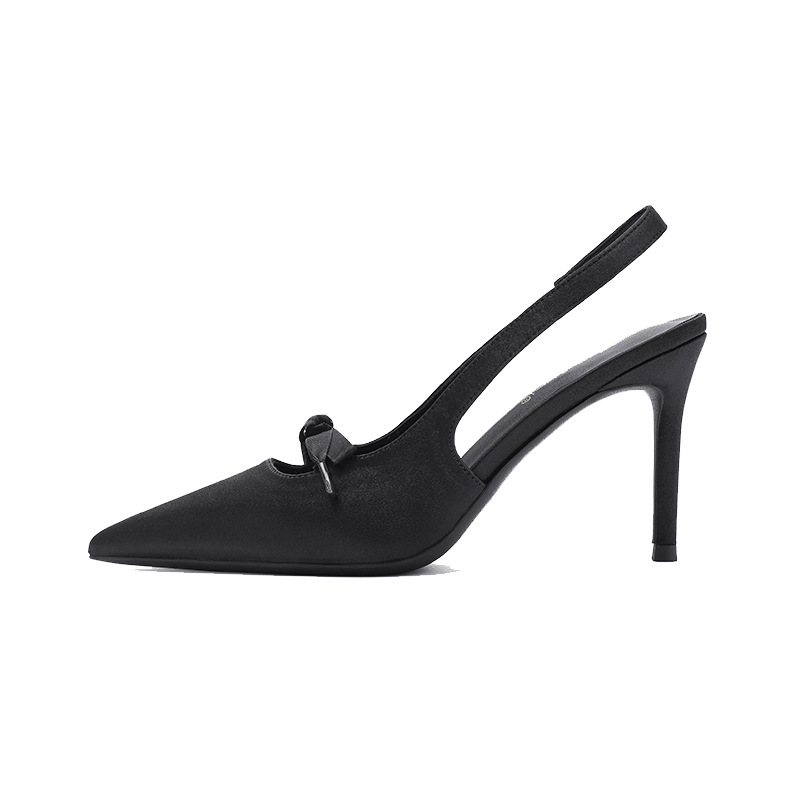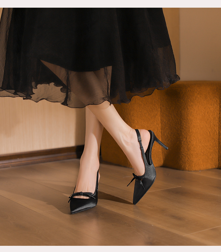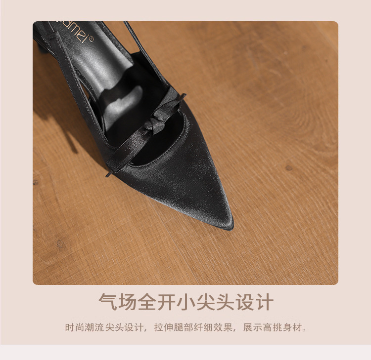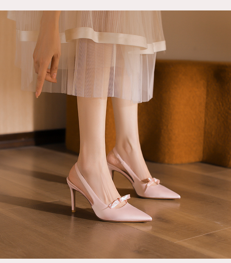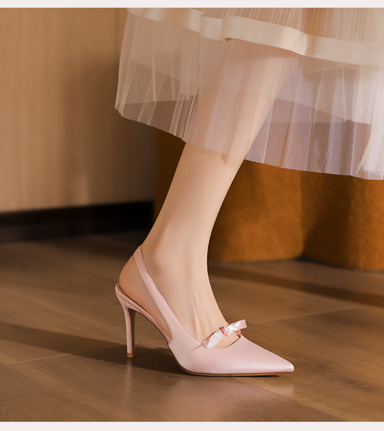 2024 봄과 가을 새로운 스타일 여성용 뒷굽 싱글 슈즈, 작은 버클, 뾰족한 발가락, 스틸레토 샌들, 다용도 새틴 보우 하이힐스토어 가기