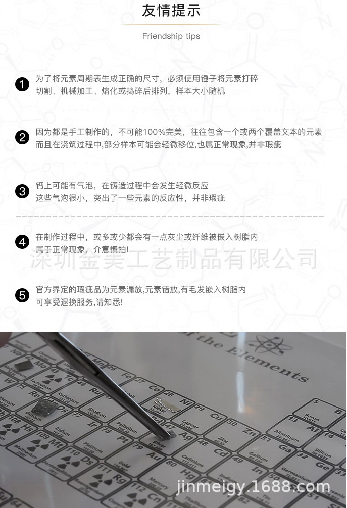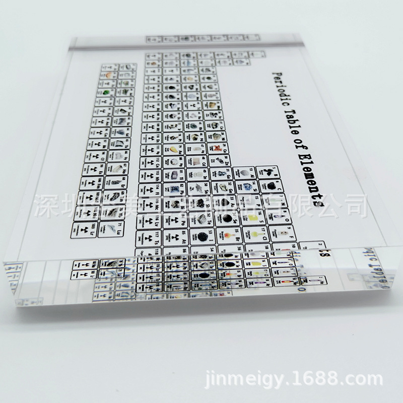 深圳金美工艺制品有限公司创办于2005年 ,一般纳税人资格,自有进出口权,自有品牌自产自销,拥有厂房面积近5000平方,现有员工50多名,工厂15年专注生产研发设计实物元素周期表摆件 印刷元素周期表 化学水晶元素周期表 水晶化学元素周期表展示牌 元素实物内嵌内埋工艺品 亚克力浇铸内置内嵌工艺品 亚克力浇筑内埋工艺品 亚克力水晶灌浇内藏镶嵌工艺礼品摆件 亚克力家居办公用品摆件 亚克力水晶学习用品摆件 各种学习展示牌节庆节日礼物,水晶亚克力,压克力,亚加力,有机玻璃,水晶,水晶胶,树脂,环氧树脂,亚克力粉,POLY工艺(Acrylic PMMA亚克力制品,亚克力工艺品,亚克力礼品摆件,亚克力收藏礼品展示品)行业开发、服务多年的技术人员,具备先进的灌浇机,抽真空机,浇铸粉机,内压机,超声波,调胶粉配方机,精密钢模具,车、刨、铣、钻、磨、抛、大型热变型、四色网点丝印、电脑雕刻、激光雕刻切割、钻石抛光机等专业制造设备。在十多年来不断实践、提高,开创出十大系列产品:眼镜系列、电脑雕刻系列、化妆品系列、纪念精品系列、广告灯箱系列、四色网点丝印系列、烟酒系列、奖牌、奖杯系列、电器鞋类系列。产品辐射至全世界全国及东南亚,远销日韩、欧美等地区,并赢得顾客的一致认同和好评。我们本着“以质量求生存,靠信誉求发展”的宗旨,“客户至上”为原则,秉持“质量唯优、客户唯本、效率唯先、服务唯好”的经营理念。从接单开始、生产制作、成品出厂,每一个工艺流程,每一个步骤,我们都高度重视,严格监察产品品质,控制生产成本,保证交货及时,并随时加强与客户的沟通。一直以来,除了我们对完美工艺的执着和坚持之外,更重要的是有客户的真诚支持和长期信赖,以其一流的产品质量和完善的售后服务体系,赢得广大客户的好评,得到了社会各界人士的关怀与厚爱,业务不断发展壮大,从而使我们逐步成为国内国外最具有口碑的专业化亚克力/压克力/亚加力/有机玻璃展示工艺制作公司之一。我们以客户的需要为目标,全心全意为客户服务。本公司将按您的要求进行设计制作,按照来样或图纸进行加工制作,在新一轮的市场竞争中,愿与广大客户携手“双赢”。热忱欢迎海内外朋友来厂指导,支持分销,跨境分销,国内分销,国内外一件代发,免费贴标签箱唛,小批量拿货拿样,小量订购,大批量订购,哇噢定制,轻定制, DIY定制来样加工,看样订货,欢迎跨境电商客商,国内外贸易商,国内外电商参观光临洽谈业务!