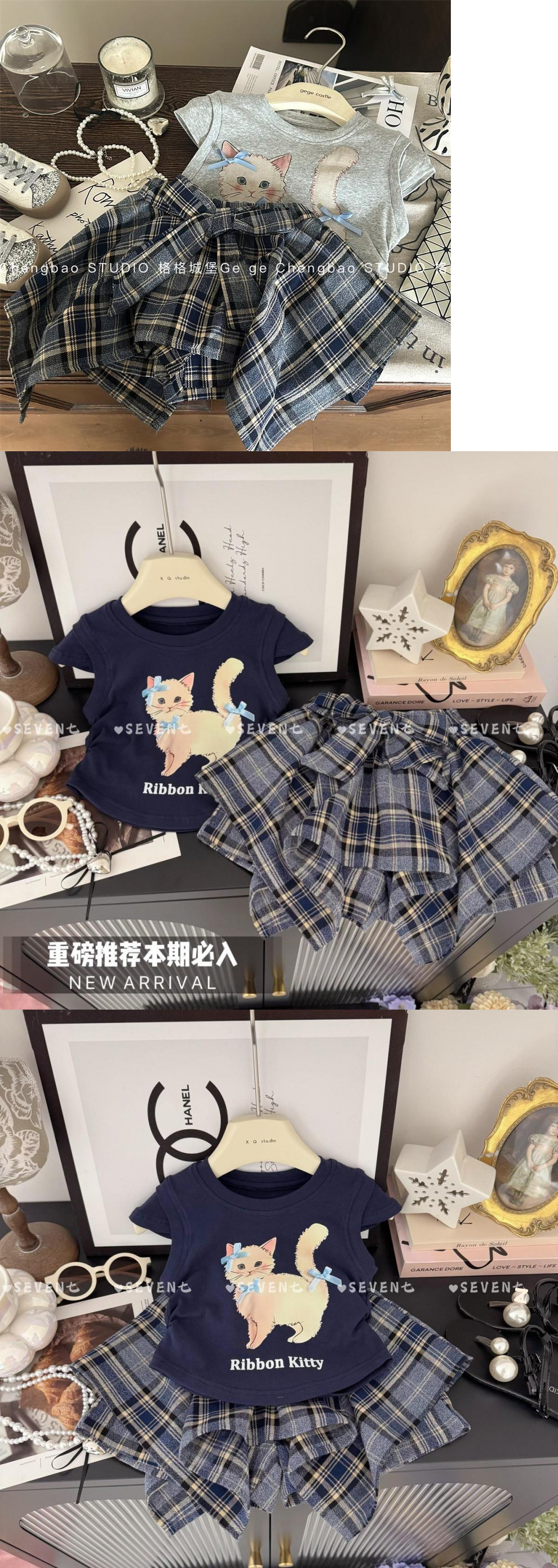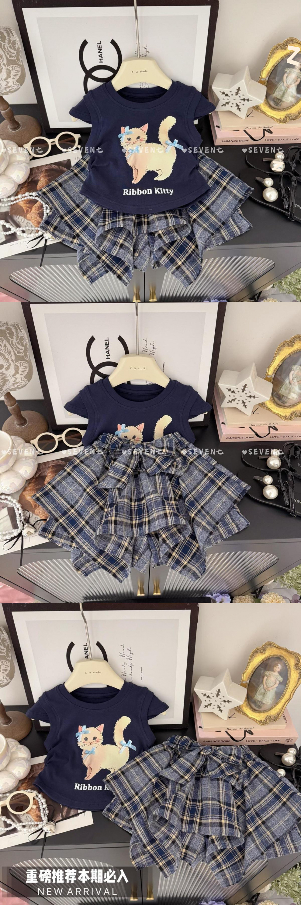 여자 정장 2025 새로운 여름 아기 만화 티셔츠 유행 격자 무늬 치마 바지 한국 스타일 유행 다목적 여름 옷
