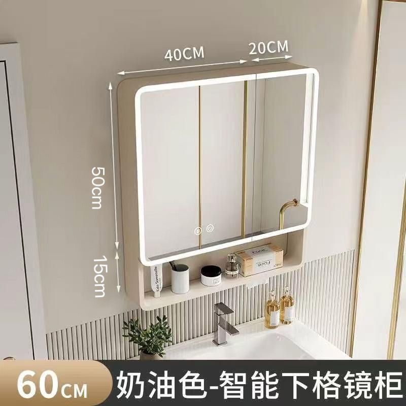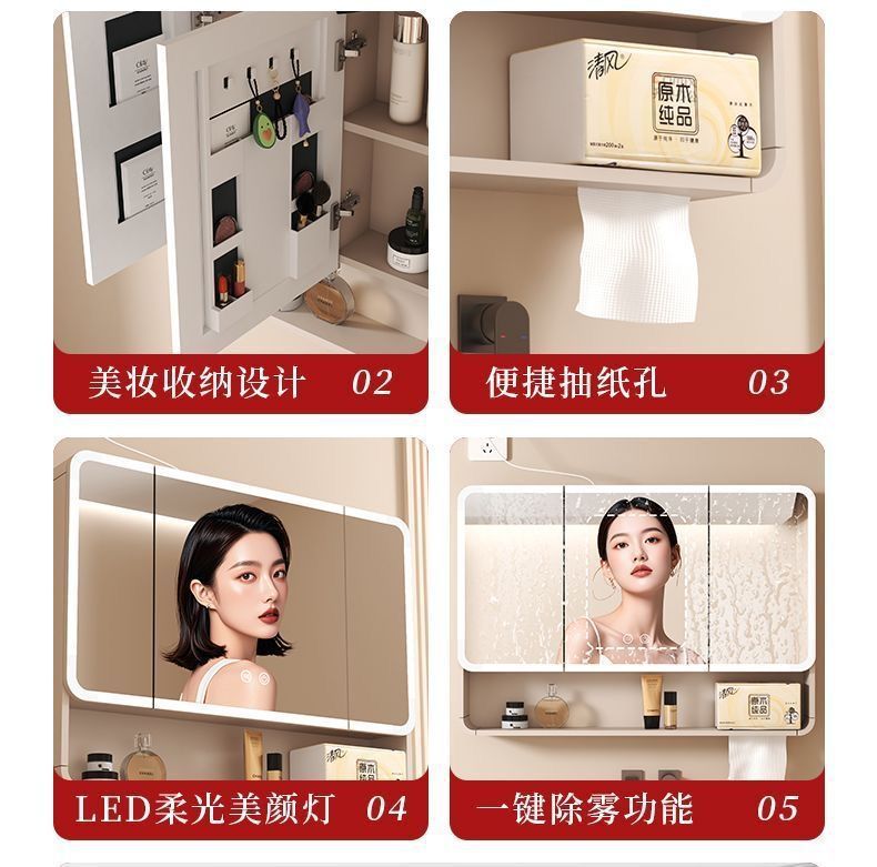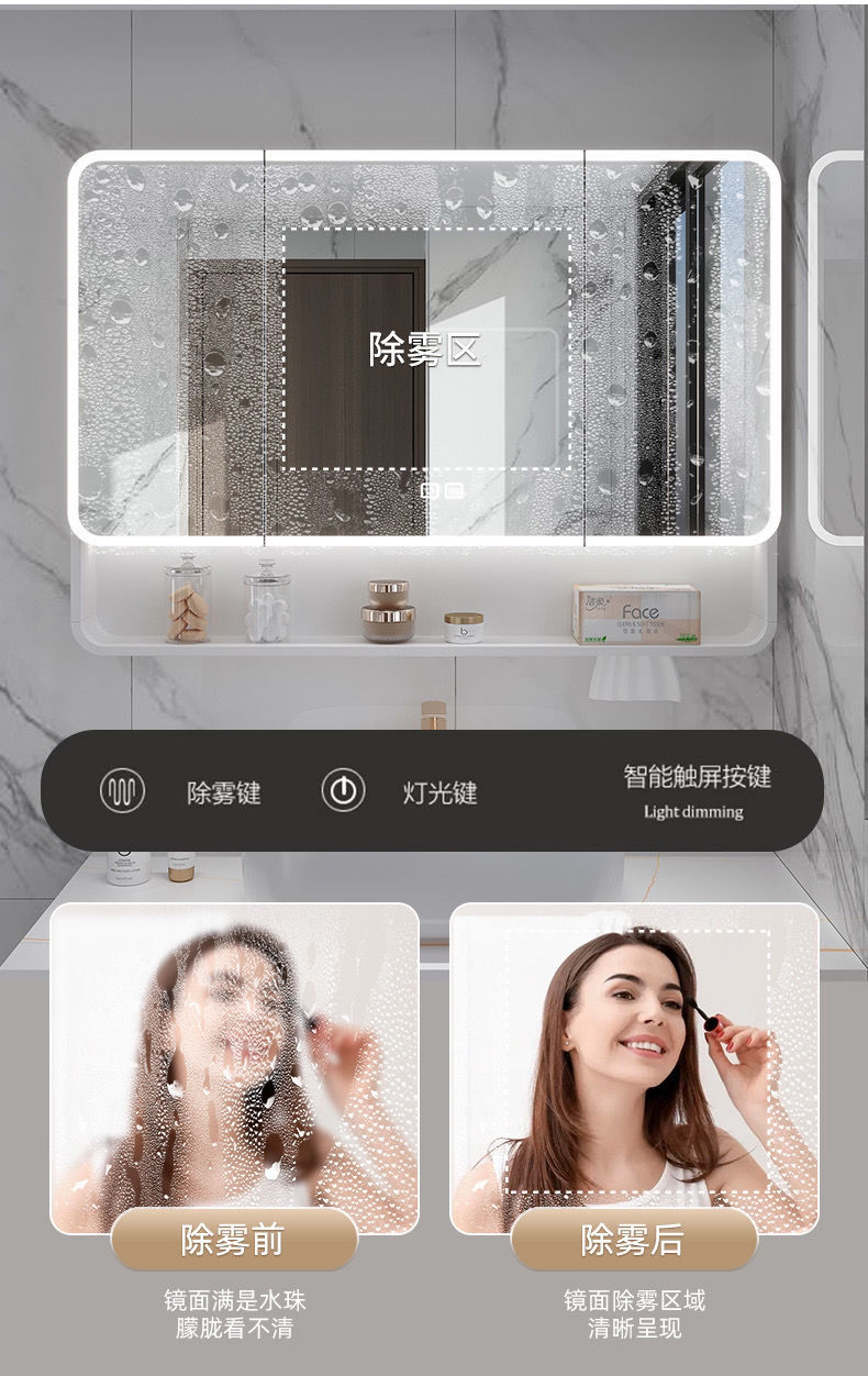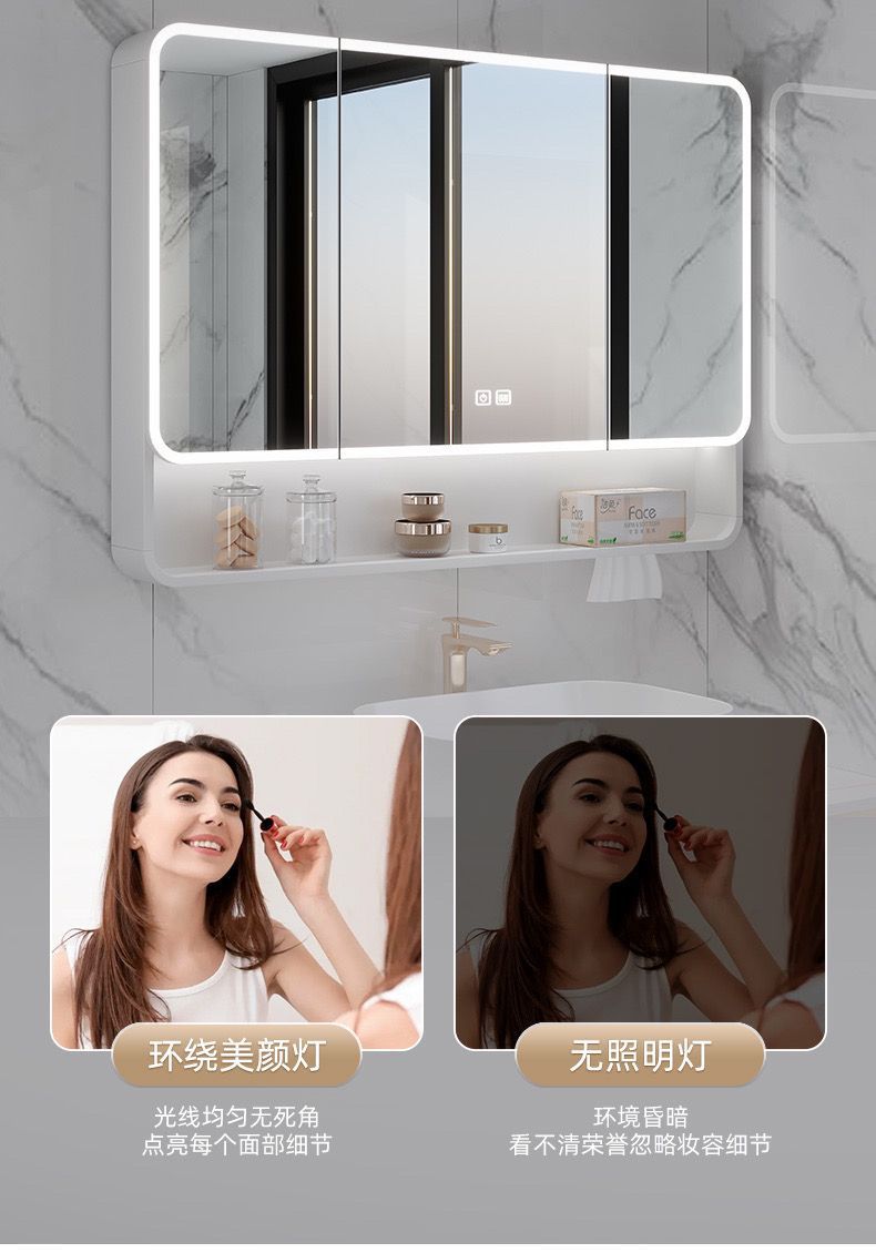 공간 알루미늄 아크 두꺼운 탄소강 램프 안개 제거 스마트 터치 스크린 미러 캐비닛 욕실 미러 캐비닛 보관 뷰티 랙