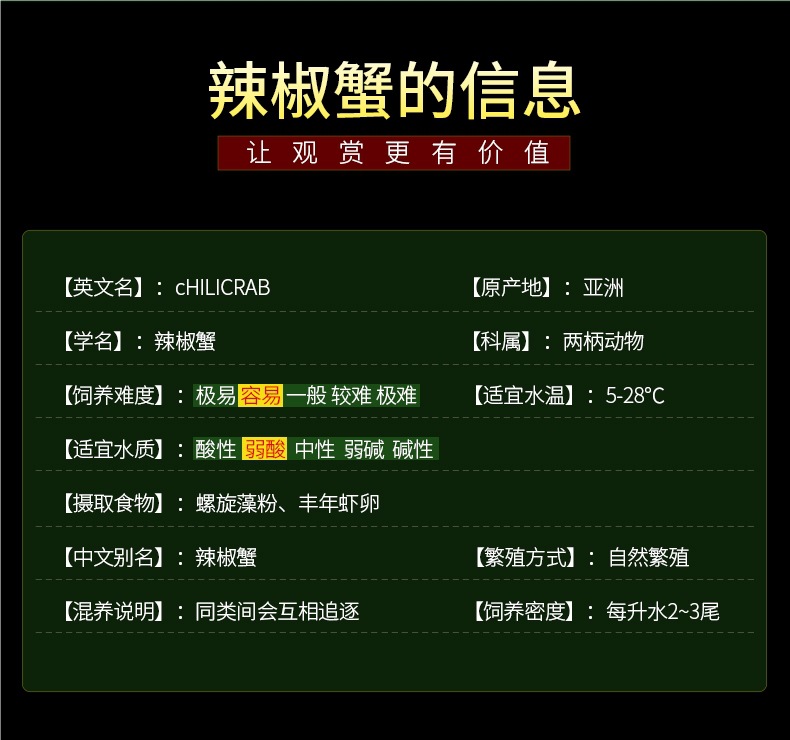 • 수컷과 암컷 칠리 크랩 5쌍, 2쌍 무료~사료 무료