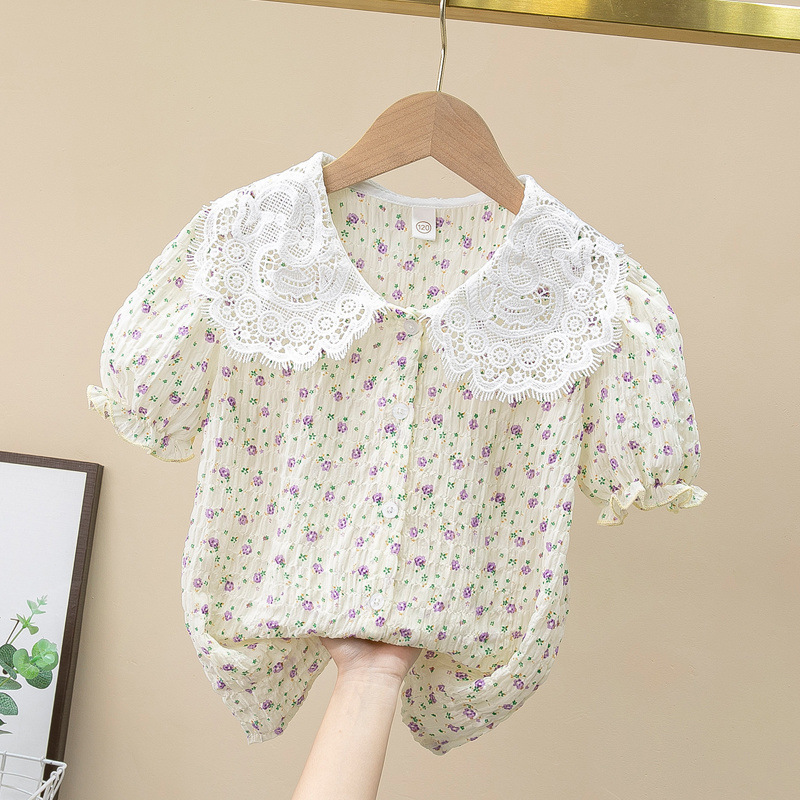 여자 여름 셔츠 2025 새로운 한국 스타일 여자 반팔 꽃 셔츠 중대형 어린이 쉬폰 탑 유행스토어 가기