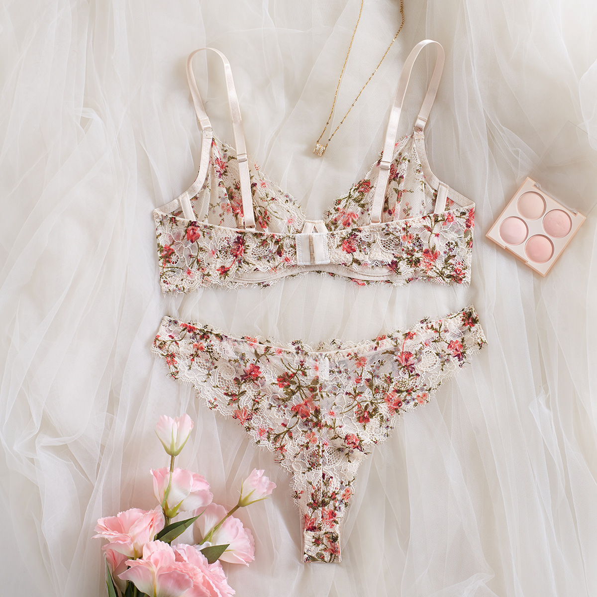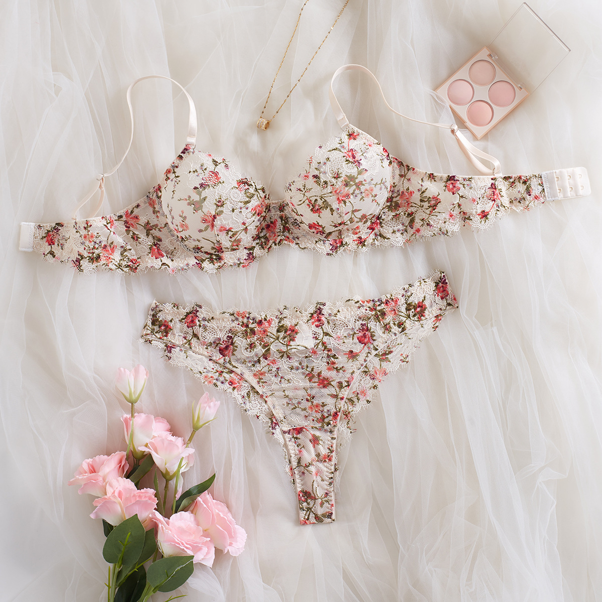 프랑스 모네 정원 유화 꽃 레이스 속눈썹 레이스 속옷 섹시 할로우 편안한 푸시 업 브라 세트