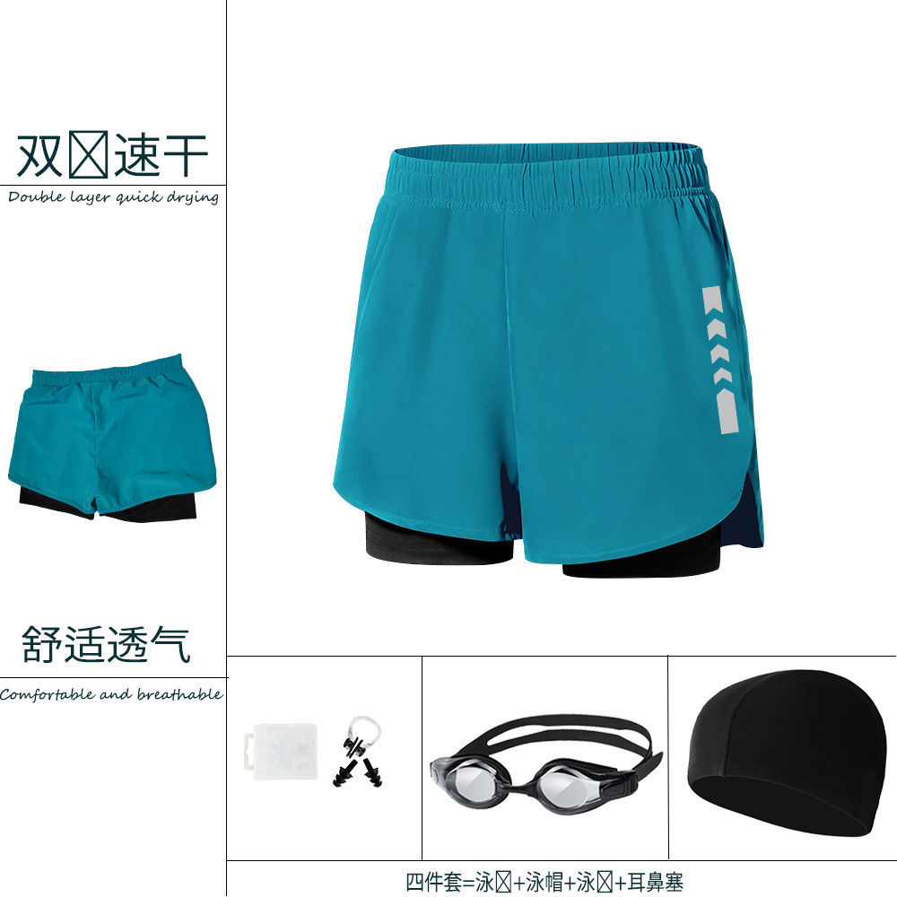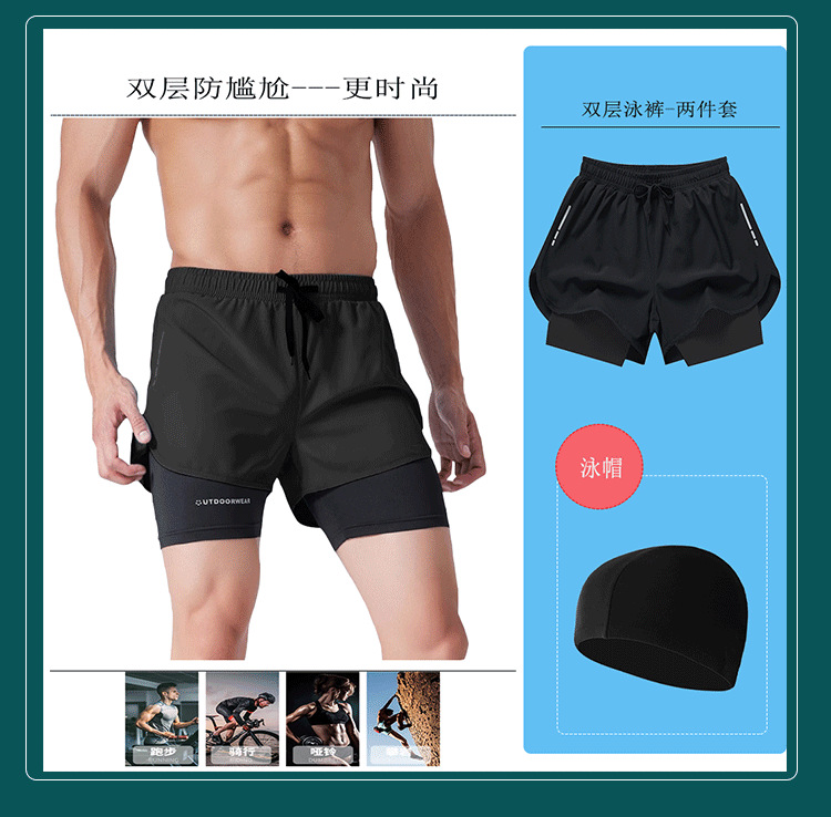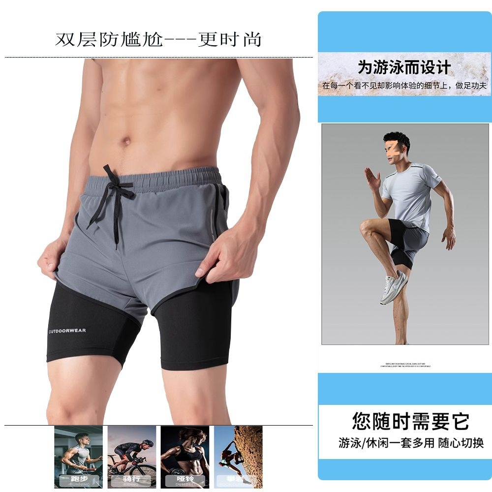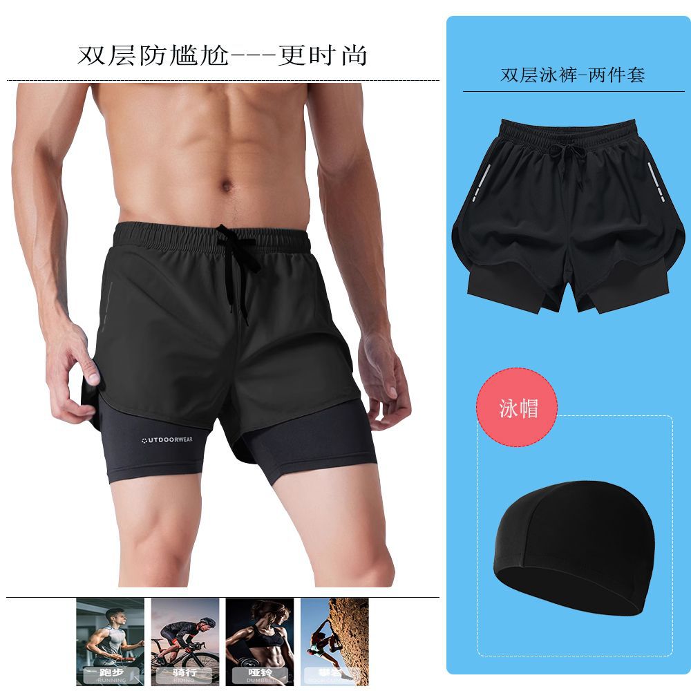 남성용 수영복, 스포츠 더블 레이어, 당황 방지, 속건성, 통기성, 루즈한 반바지, 비치 팬츠, 3점 런닝 팬츠