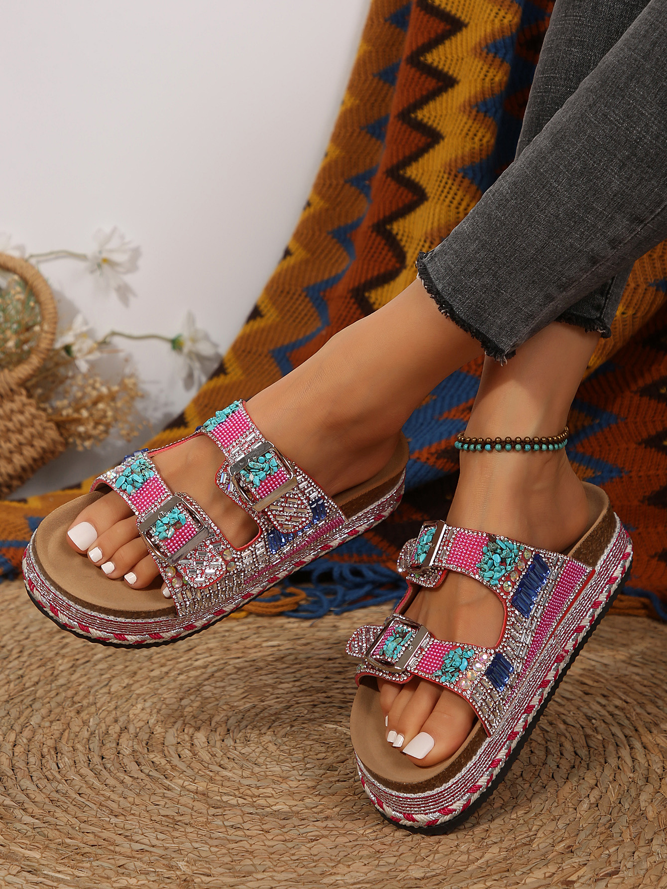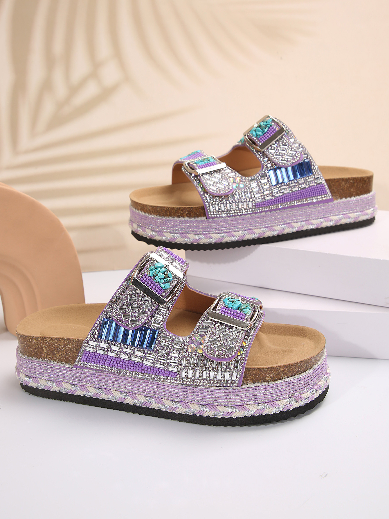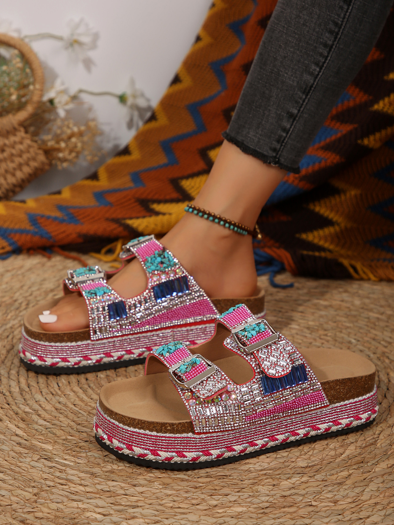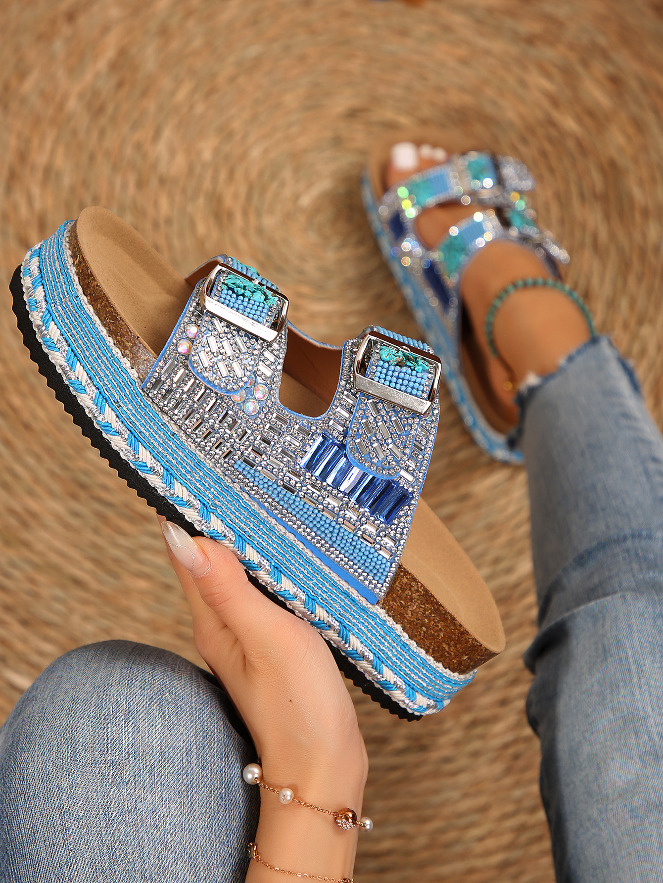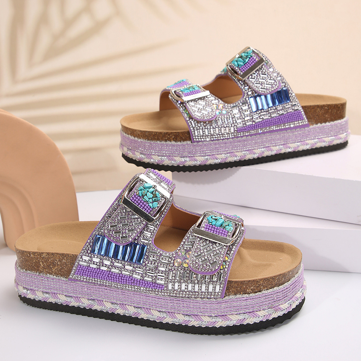 2025년 여름 신상 두꺼운 밑창 더블 버튼 코르크 슬리퍼 대형 라인스톤 대마 로프 비치 슬리퍼 여성용 43 크로스보더 직접 공급