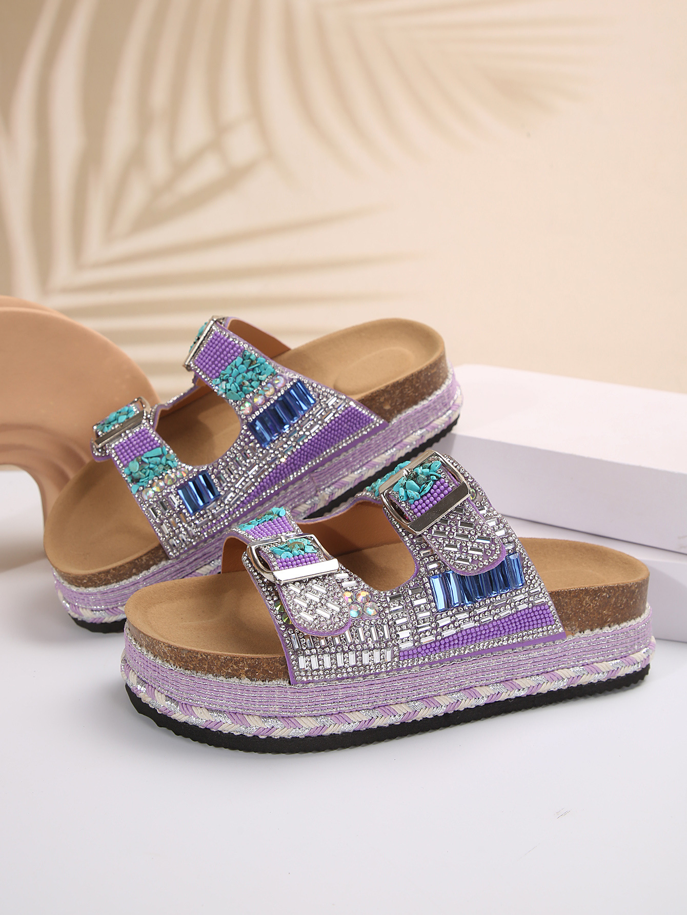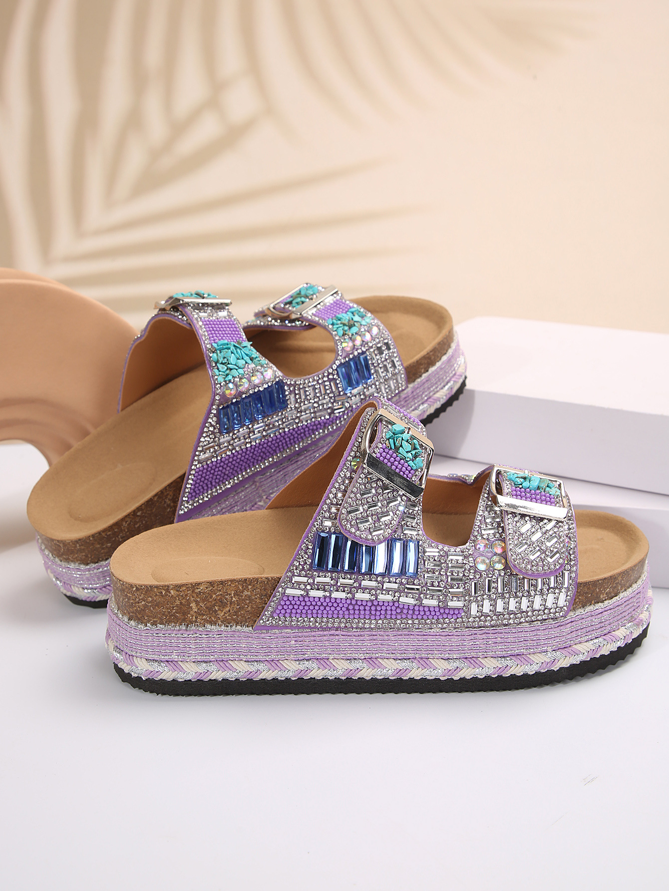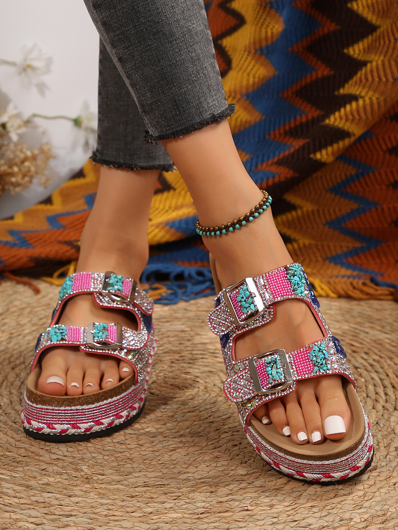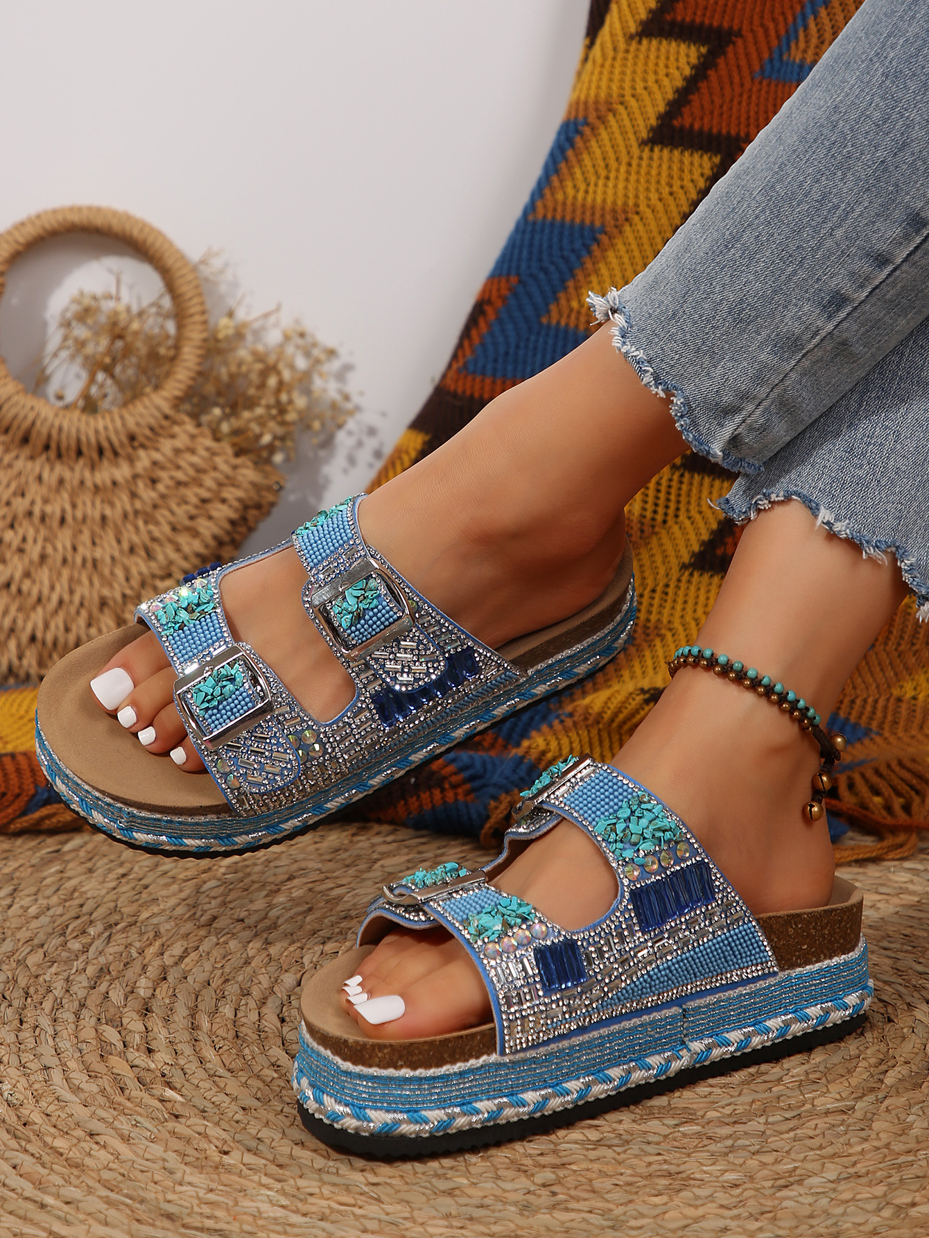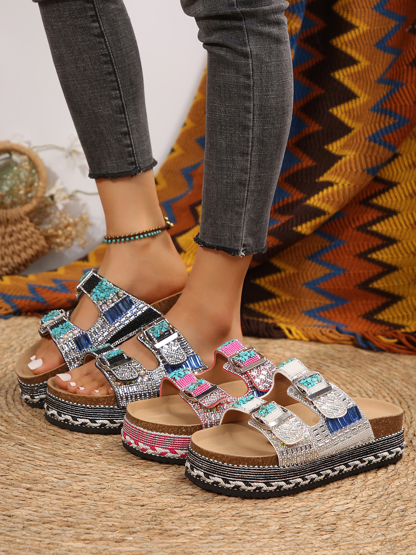2025년 여름 신상 두꺼운 밑창 더블 버튼 코르크 슬리퍼 대형 라인스톤 대마 로프 비치 슬리퍼 여성용 43 크로스보더 직접 공급