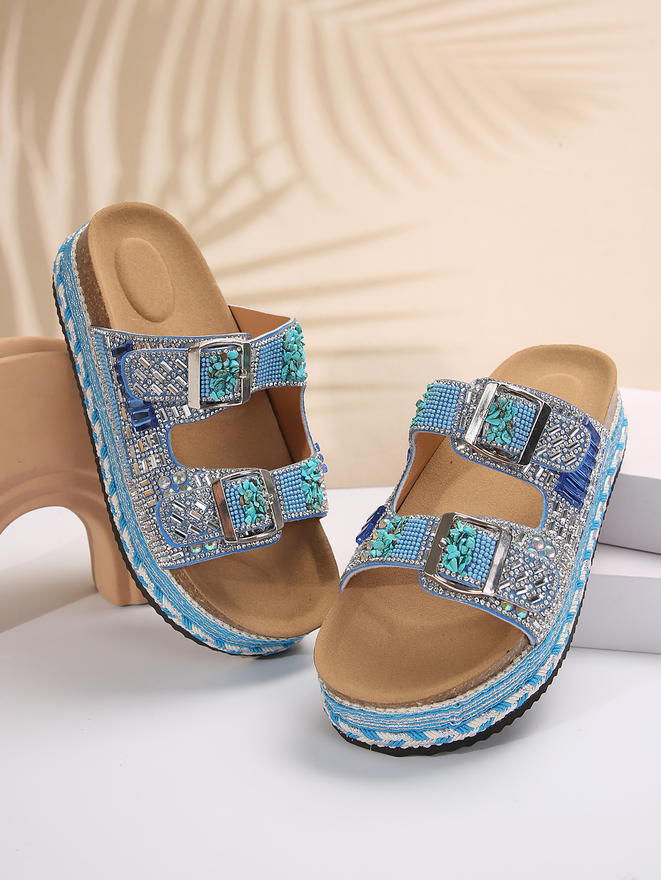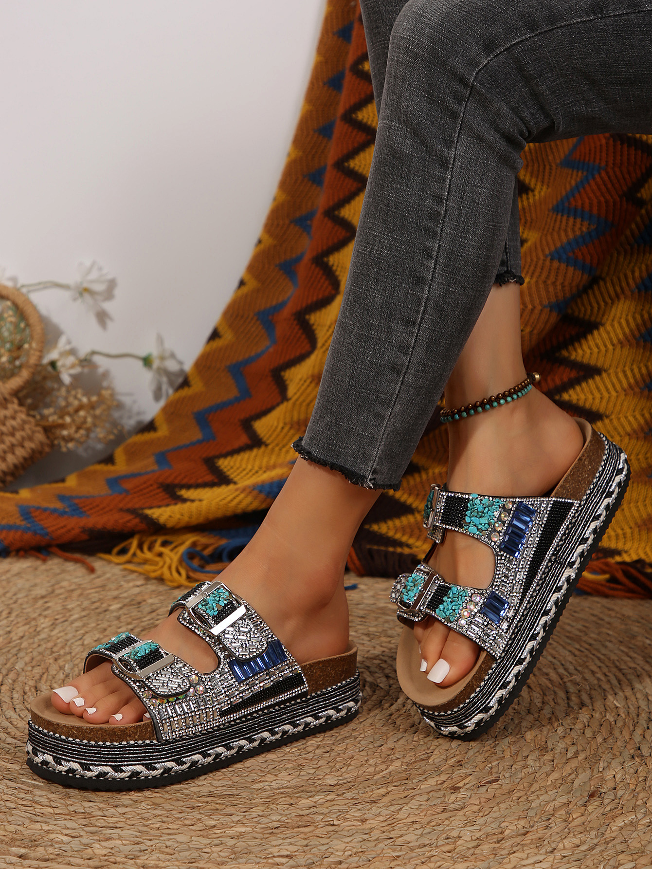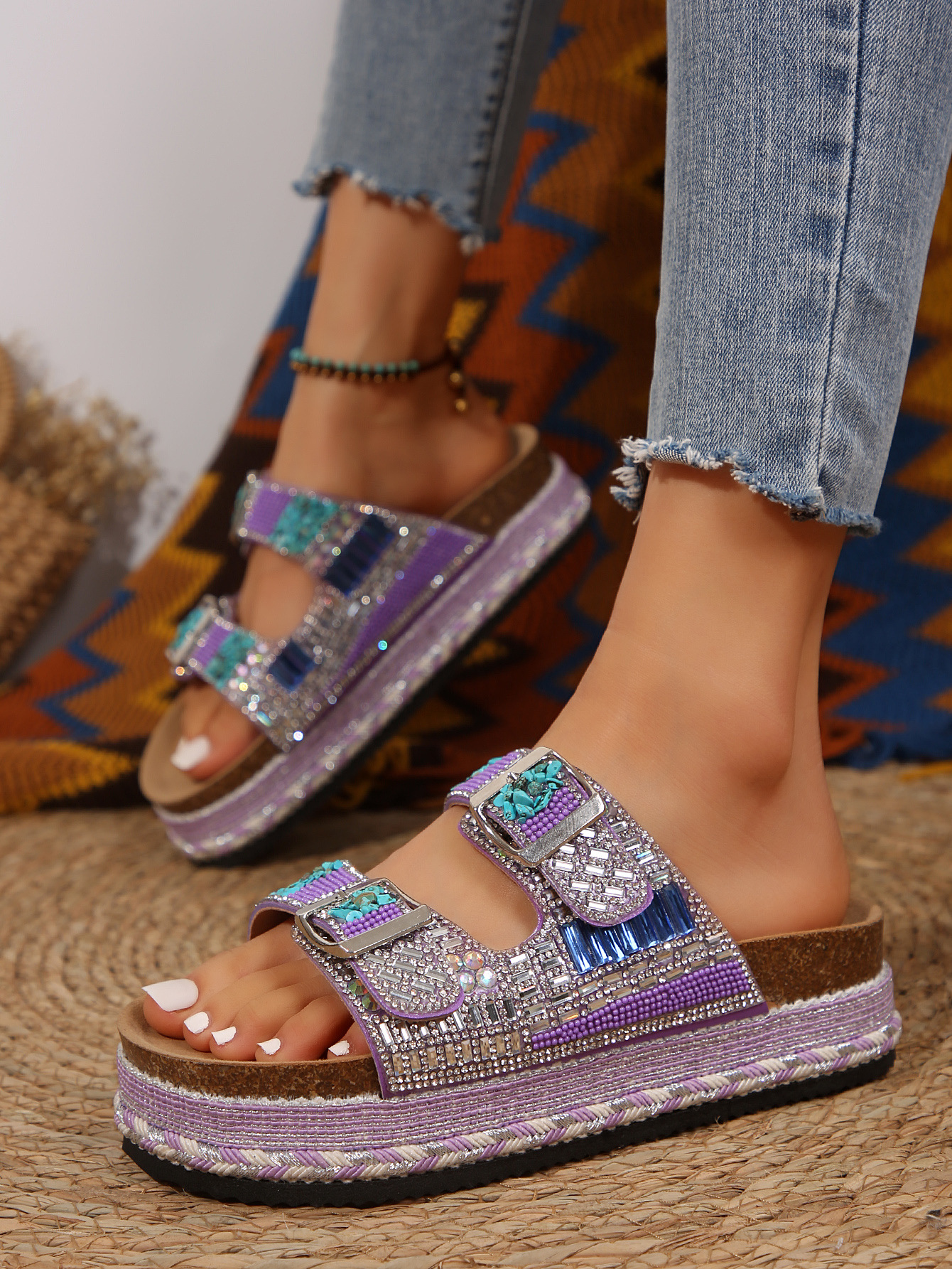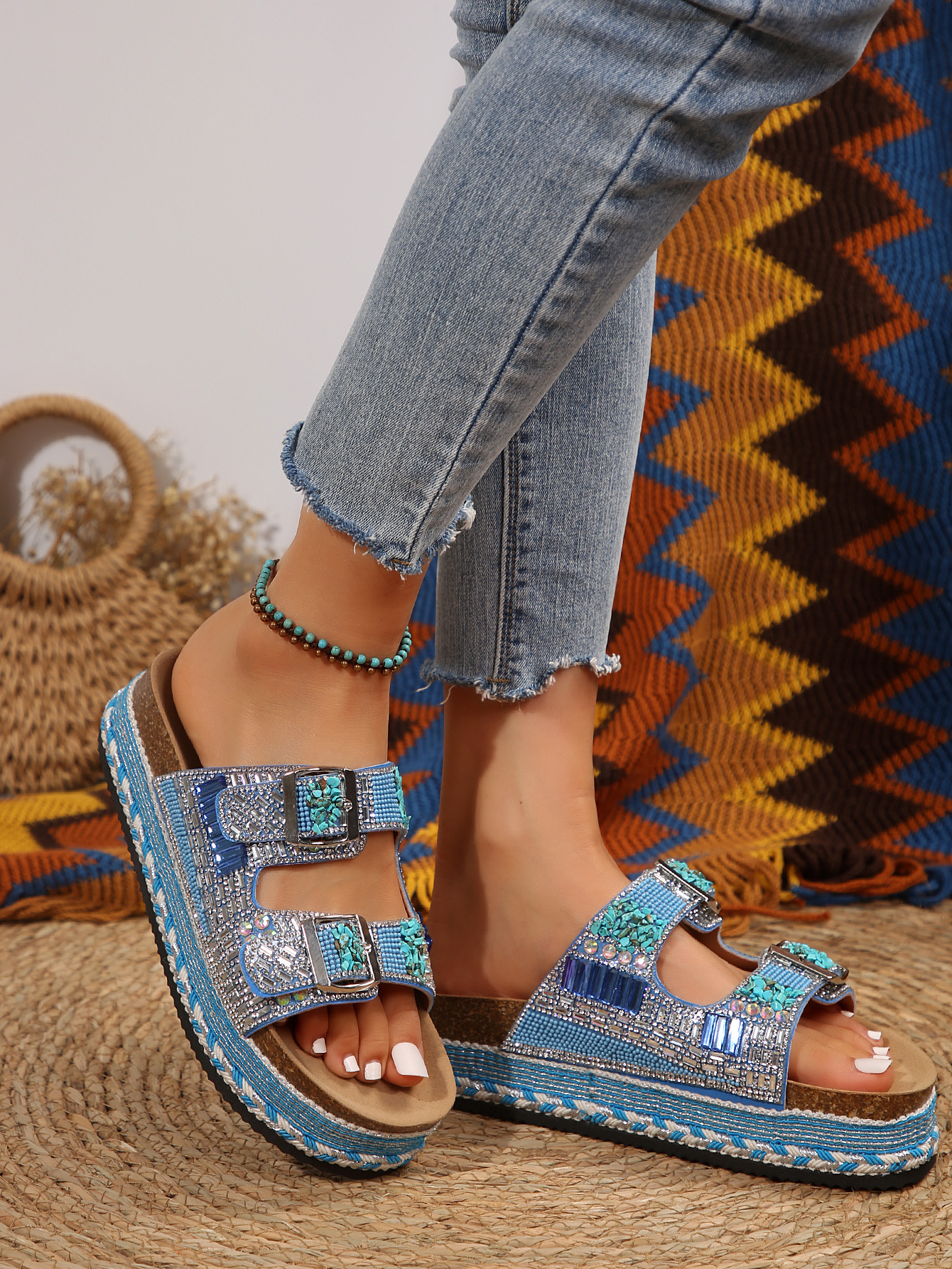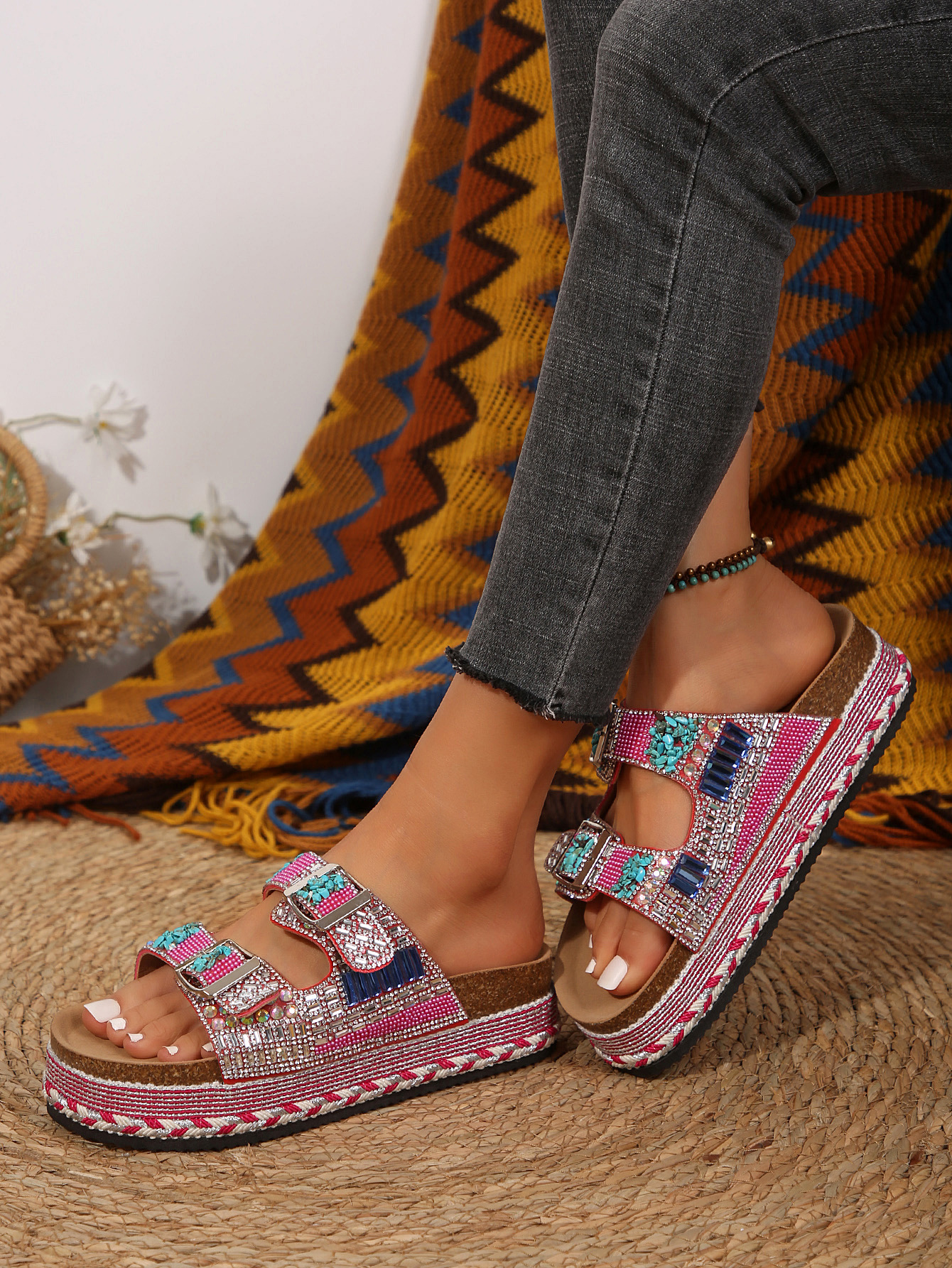 2025년 여름 신상 두꺼운 밑창 더블 버튼 코르크 슬리퍼 대형 라인스톤 대마 로프 비치 슬리퍼 여성용 43 크로스보더 직접 공급