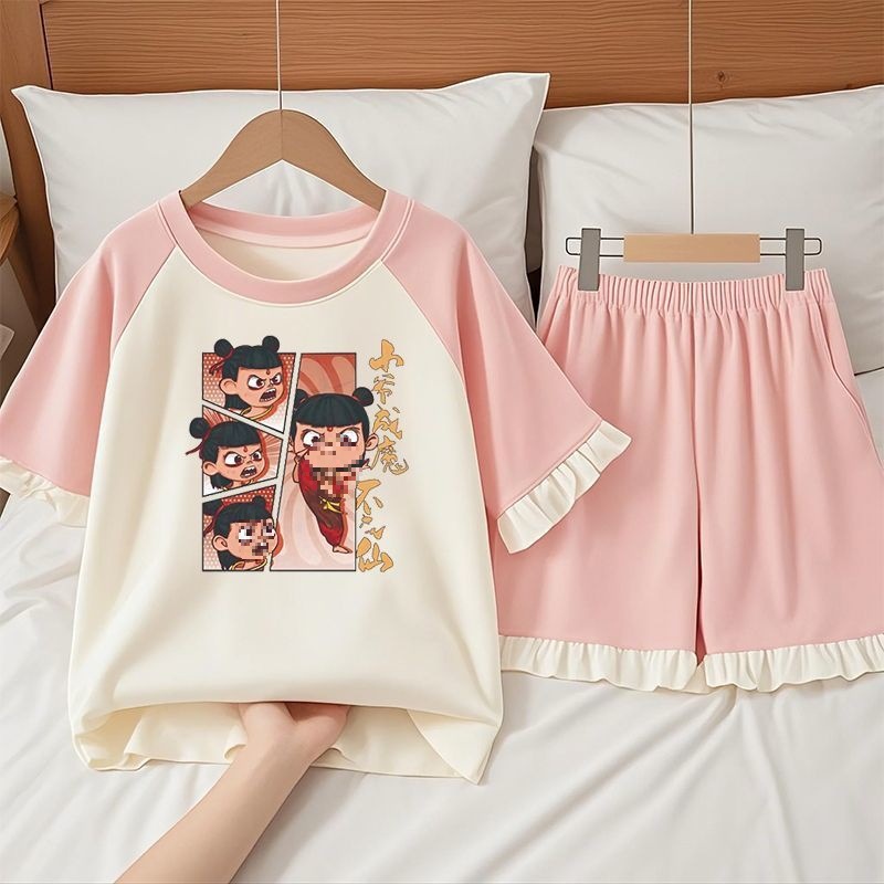 여아 순면 잠옷 2025 여름 작은 Nezha 반팔 반바지 중형 및 대형 아동복은 밖에서 착용 가능