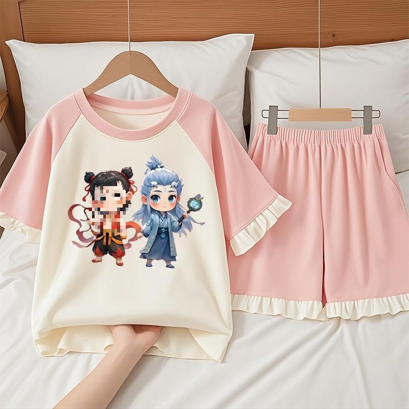 여아 순면 잠옷 2025 여름 작은 Nezha 반팔 반바지 중형 및 대형 아동복은 밖에서 착용 가능스토어 가기