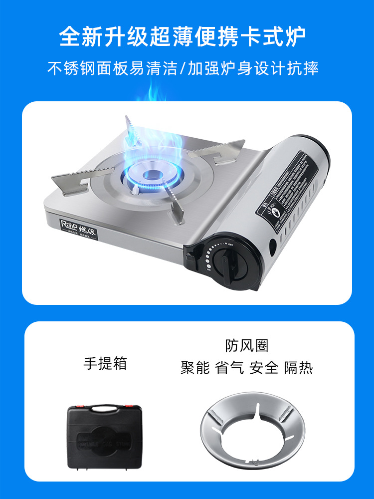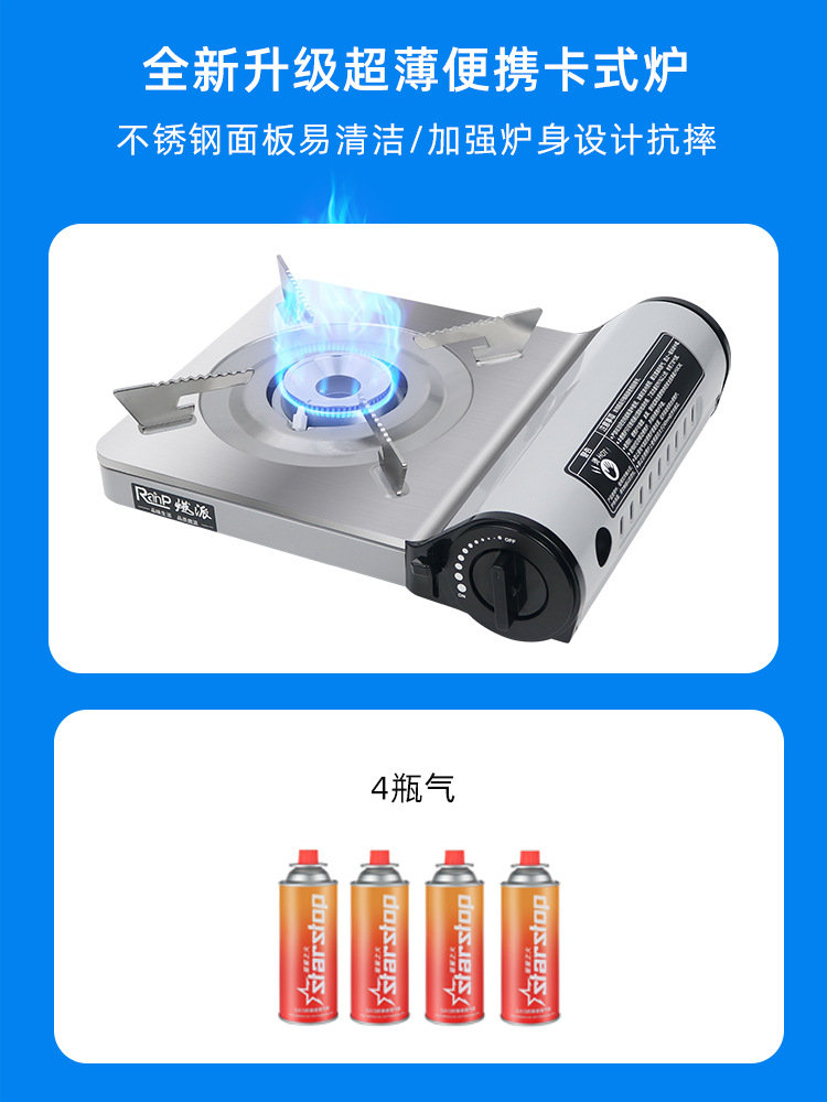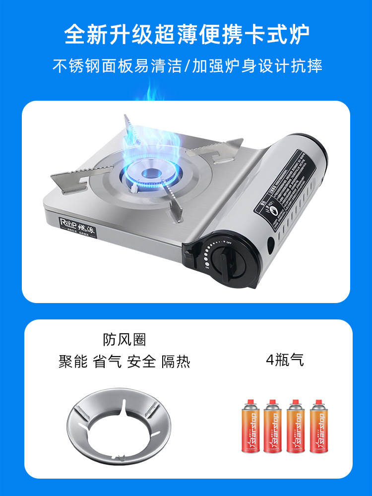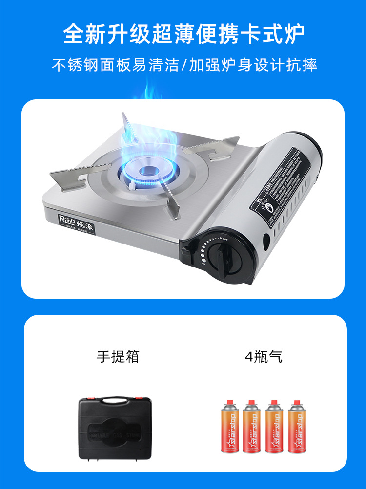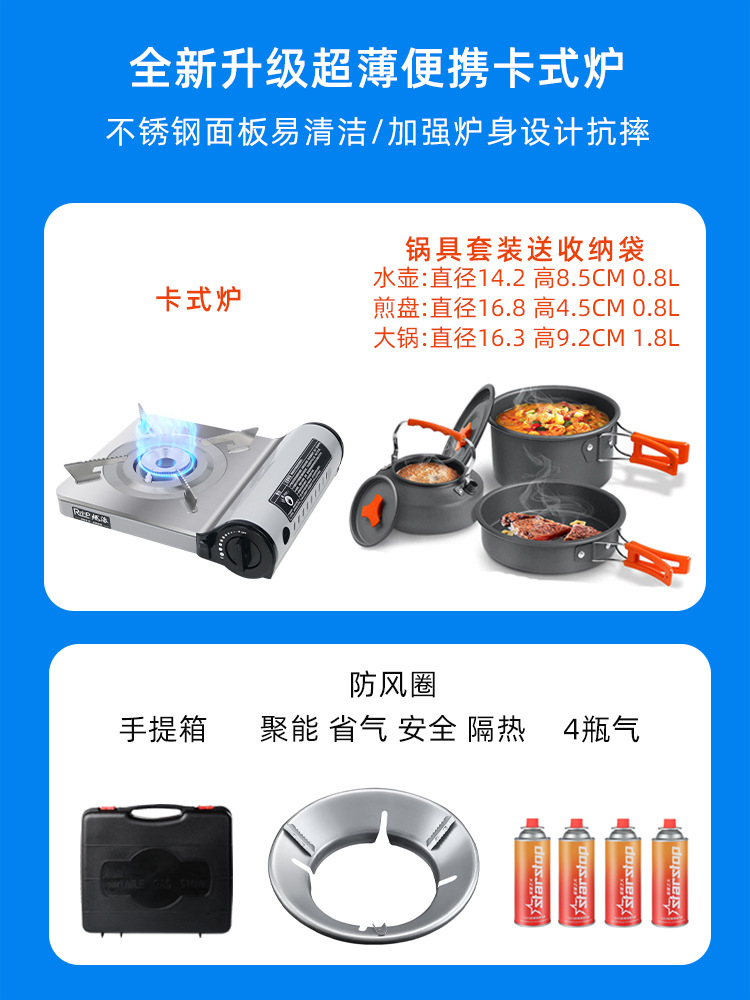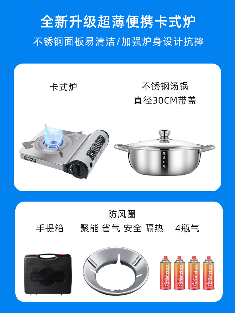 • 업그레이드 및 강화된 카세트 스토브 + 휴대용 상자 + 방풍 링 + 가스 4병 + 스테인레스 스틸 수프 냄비