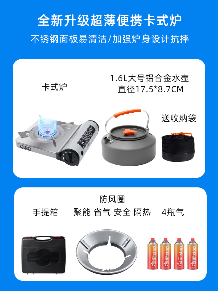 • 업그레이드 및 강화된 카세트 스토브 + 여행가방 + 방풍링 + 가스 4병 + 1.6L 대형 주전자