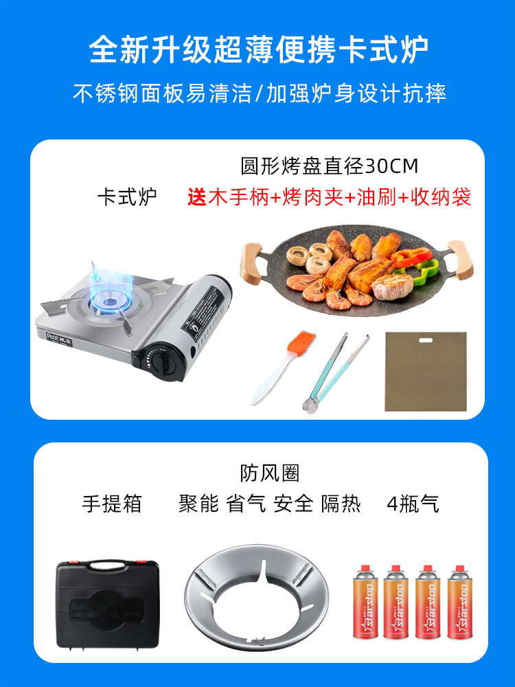• 업그레이드 및 강화된 카세트 스토브 + 여행가방 + 방풍링 + 가스 4병 + 베이킹 팬