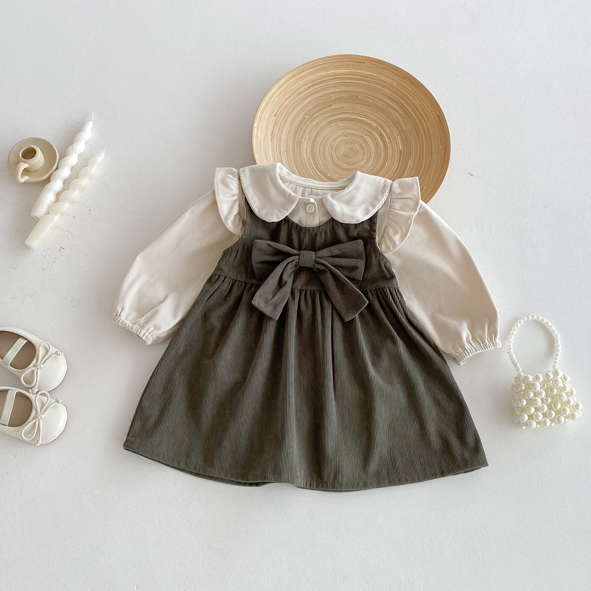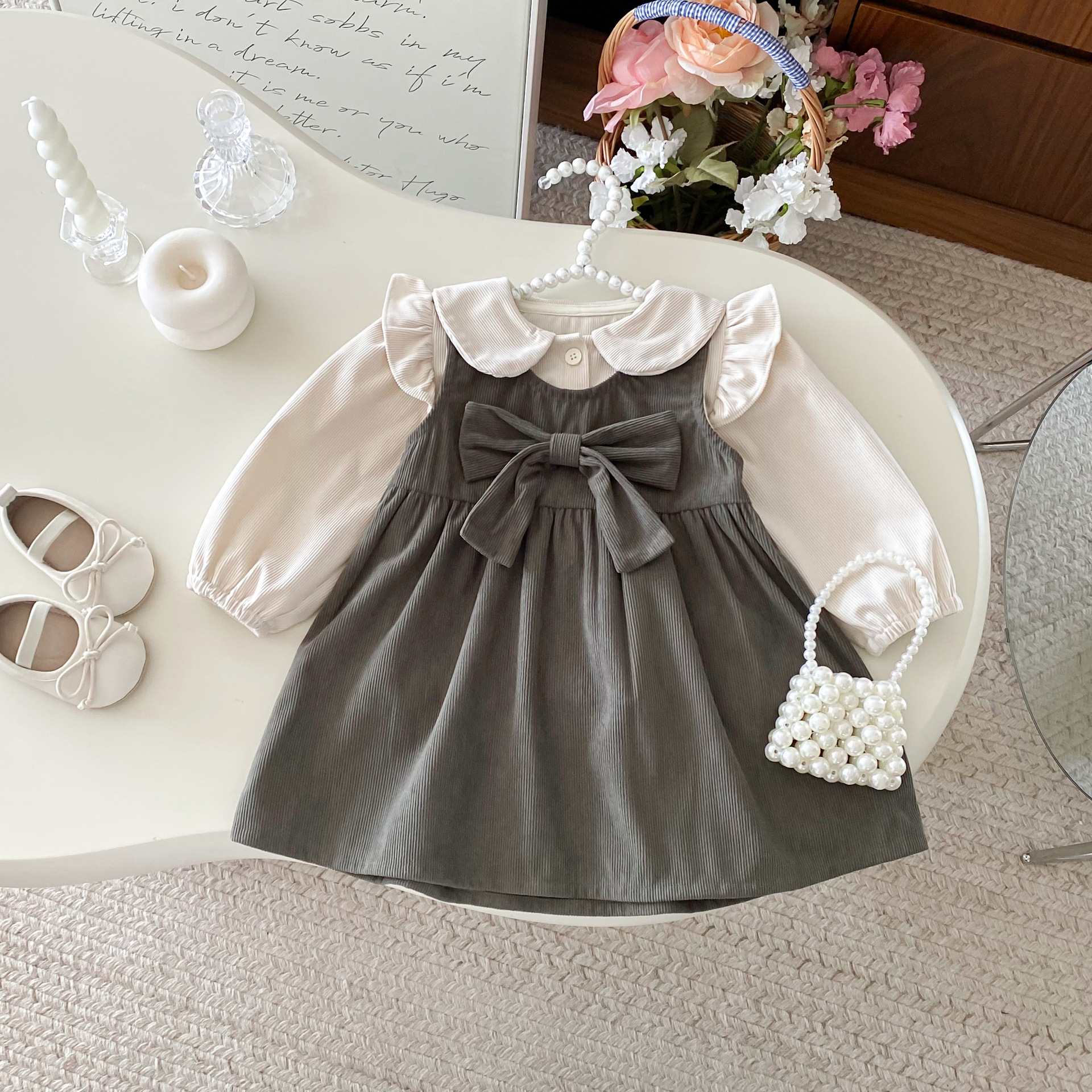 여자 한국 스타일 가을 드레스 인형 칼라 카디건 긴 소매 탑 아기 소녀 봄, 가을 코듀로이 조끼 드레스스토어 가기