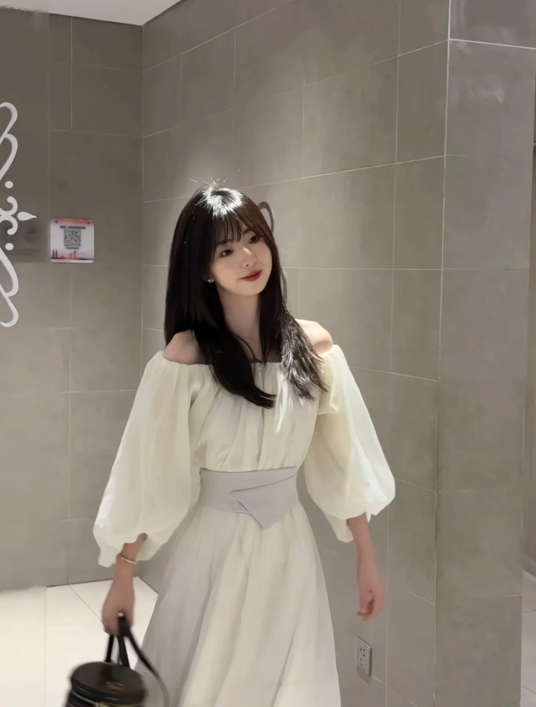 [이백] 일본 신상 달콤하고 우아한 원라인 칼라 오프숄더 퍼프슬리브 쉬폰 셔츠 25149