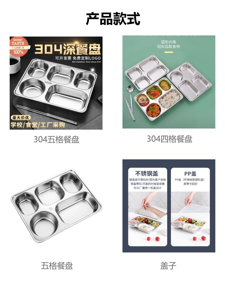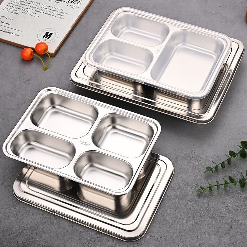 두꺼운 304 스테인리스 식판, 칸막이가 있는 학생 식당용 도시락, 뚜껑이 있는 깊은 도시락, 고급스러운 트레이스토어 가기