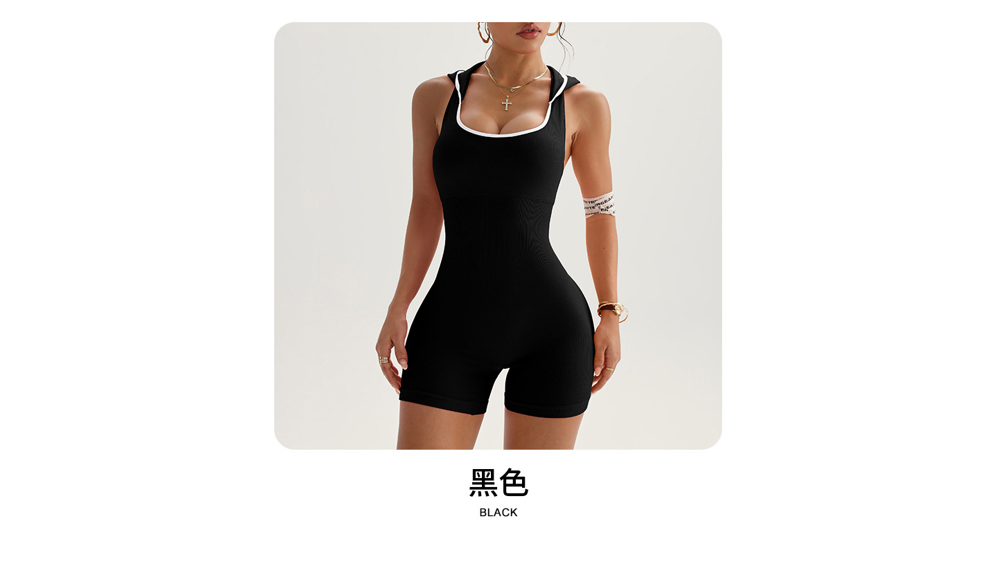 Xiyin 인기 스포츠 요가 후드 점프 슈트 민소매 후드 속건성 스레드 타이트 피트니스 점프 슈트 요가 슈트