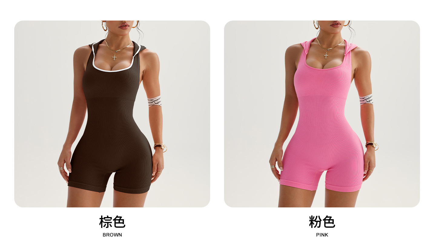 Xiyin 인기 스포츠 요가 후드 점프 슈트 민소매 후드 속건성 스레드 타이트 피트니스 점프 슈트 요가 슈트스토어 가기