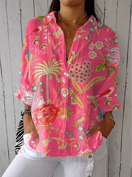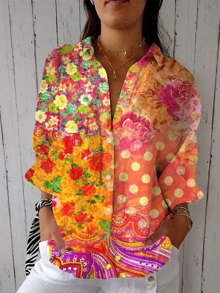 아마존 봄과 여름 새로운 3D 인쇄 옷깃 캐주얼 셔츠 여성 창조적 인 패션 꽃 꽃 셔츠 없음